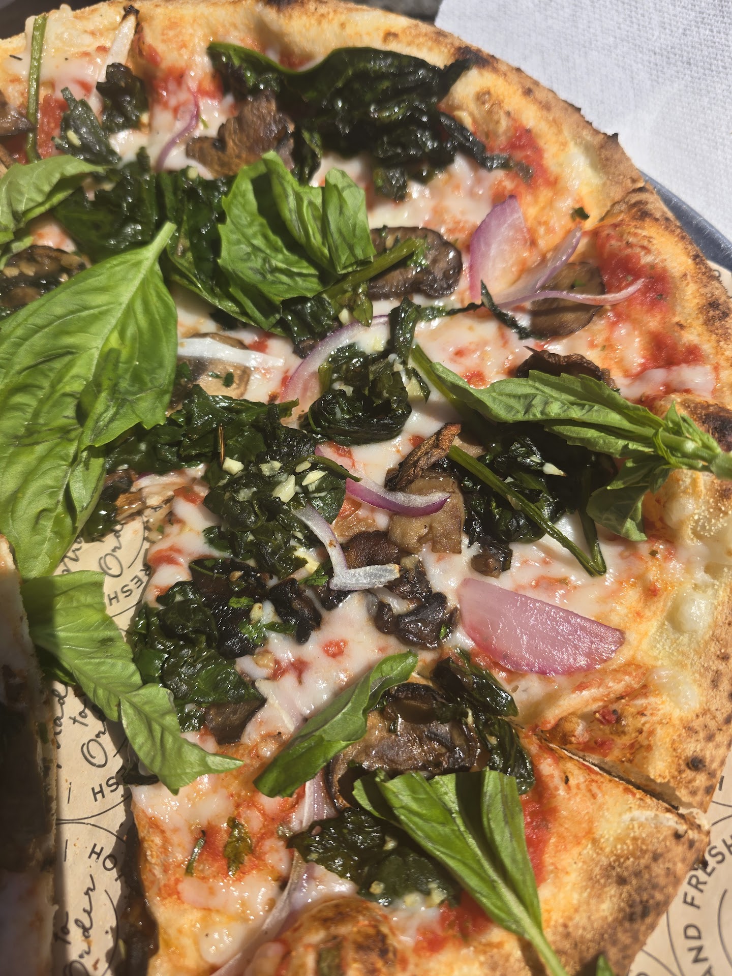 Read moreI appreciated the friendly customer service and the vegan Chef's specials. I ordered 2 pizzas and I have got to say, these guys know what's up. The crust was perfect, according to my 14 year old, the best he's ever had! One of the pizzas had mushrooms, sautéed spinach and red onions. The second pizza had mushrooms, caramelized onions and kalamatas. Delicious! I could eat the sautéed spinach itself by the bucket full. Don't forget the hot honey to top it all off! There weren't any clean tables, unfortunately, but it was pretty hoppin...