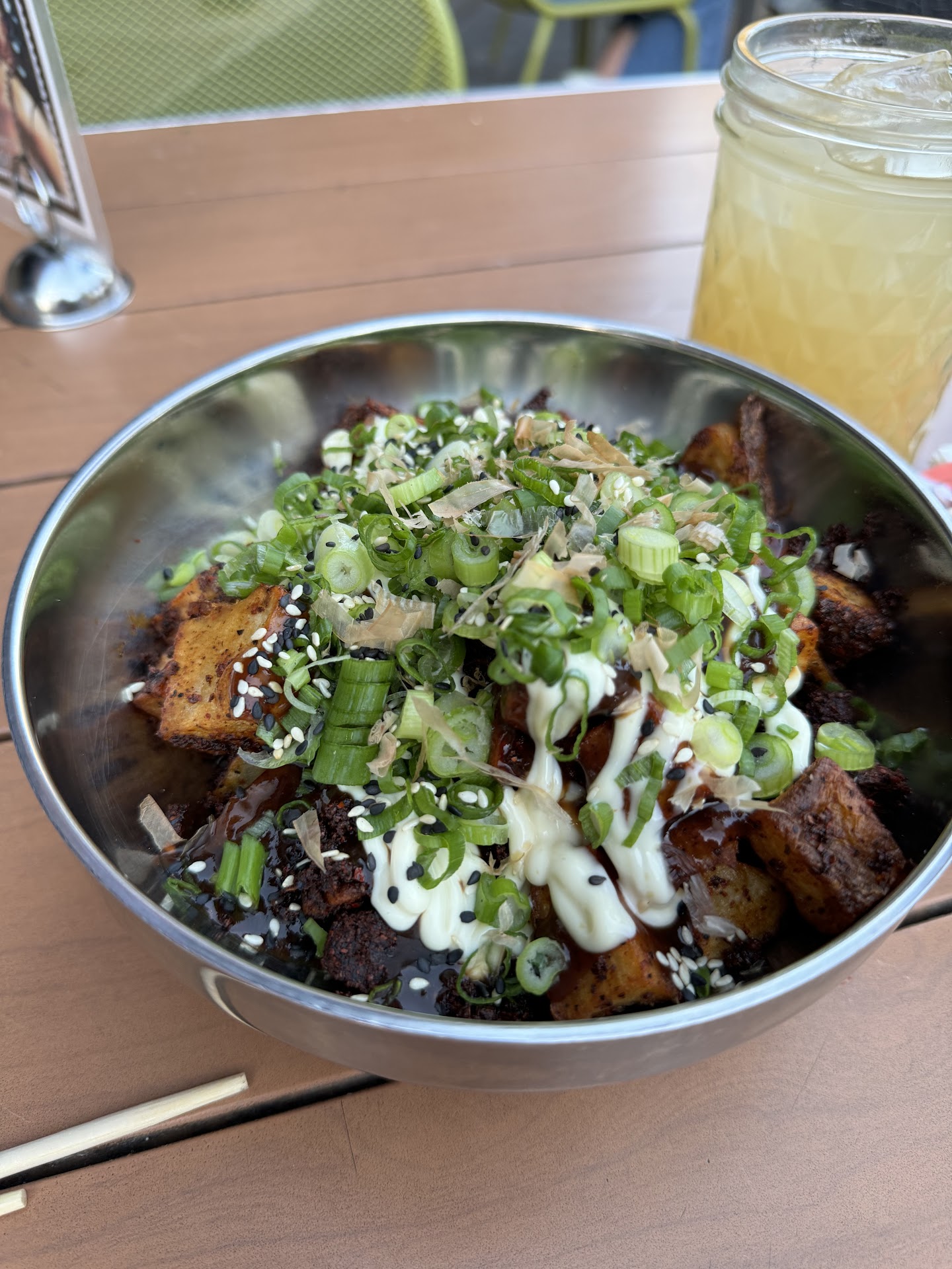 First the Chicken was extremely chewy. Not crispy at all. The kimchi was... kimchi. The mint lemonade was good for the drink but the drinks were about all that was good.