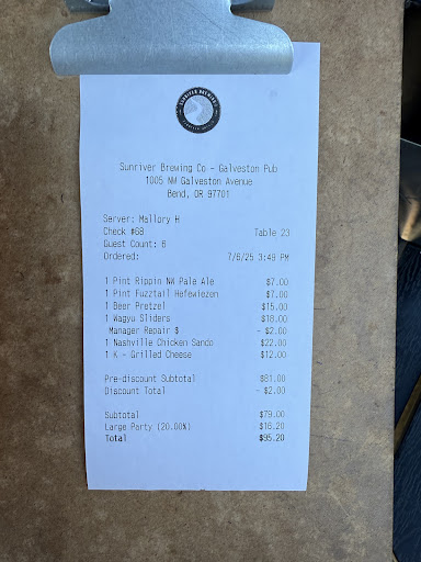Read moreI’m extremely disappointed with our recent visit to Sunriver Brewing’s Galveston location. After a fun day out, my family was looking forward to a great meal, but this experience fell far short.