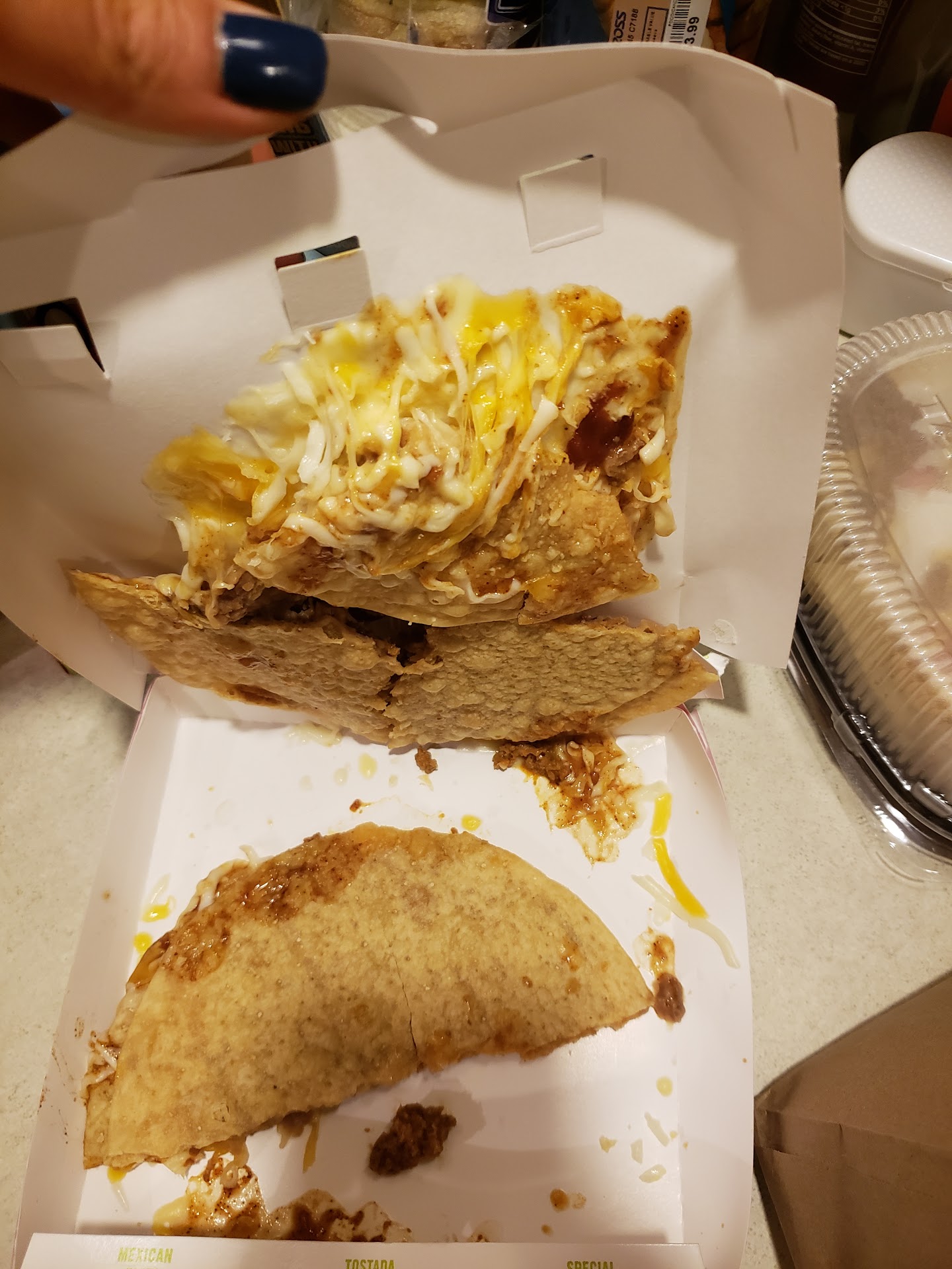 Yeah this location is cooked. I ordered ahead on the app because thatâs supposed to speed up the process - that backfired. On par with what some recent reviews have mentioned, when I showed up to pick up my food, the lobby doors were locked. My order was made and just sitting there on the counter, so I knocked on the glass only to be met with an employee motioning a âsteering wheelâ to me, suggesting Iâm to get in the 20 car drive-thru line in order to pick up my already made order. Awesome. So, I hopped in line, and 30 minutes later I finally made it to the window and received my order. I asked why the lobby was closed, and they claimed that they were short staffed even though the kitchen was packed with at least 10 employees. They claimed that a lot of the staff were from the morning shift, but that doesnât exactly change the fact that they certainly didnât appear short staffed at that given moment. And for the icing on the cake, I get home and open my box to discover that my Cheesy Gordita Crunch had been mistakenly replaced with a normal taco đ.