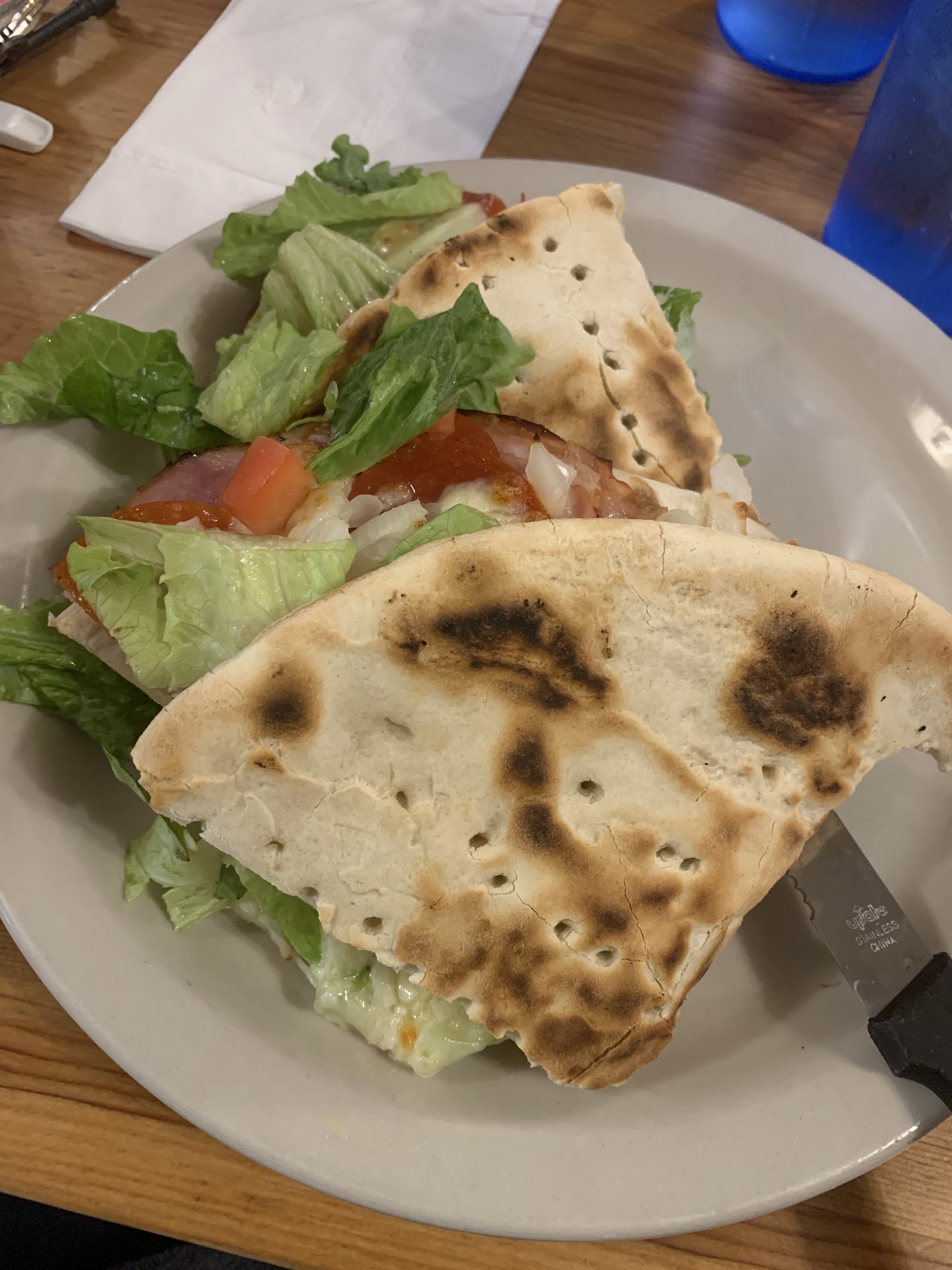 I had smoked wings. They were excellent. My friend had a steak wedge. A steak wedge is thin crust, similar to pizza, stuffed with steak, lettuce, tomatoe, and cheese. It was huge. More like a meal to be shared. It looked delicious and she said it was.
