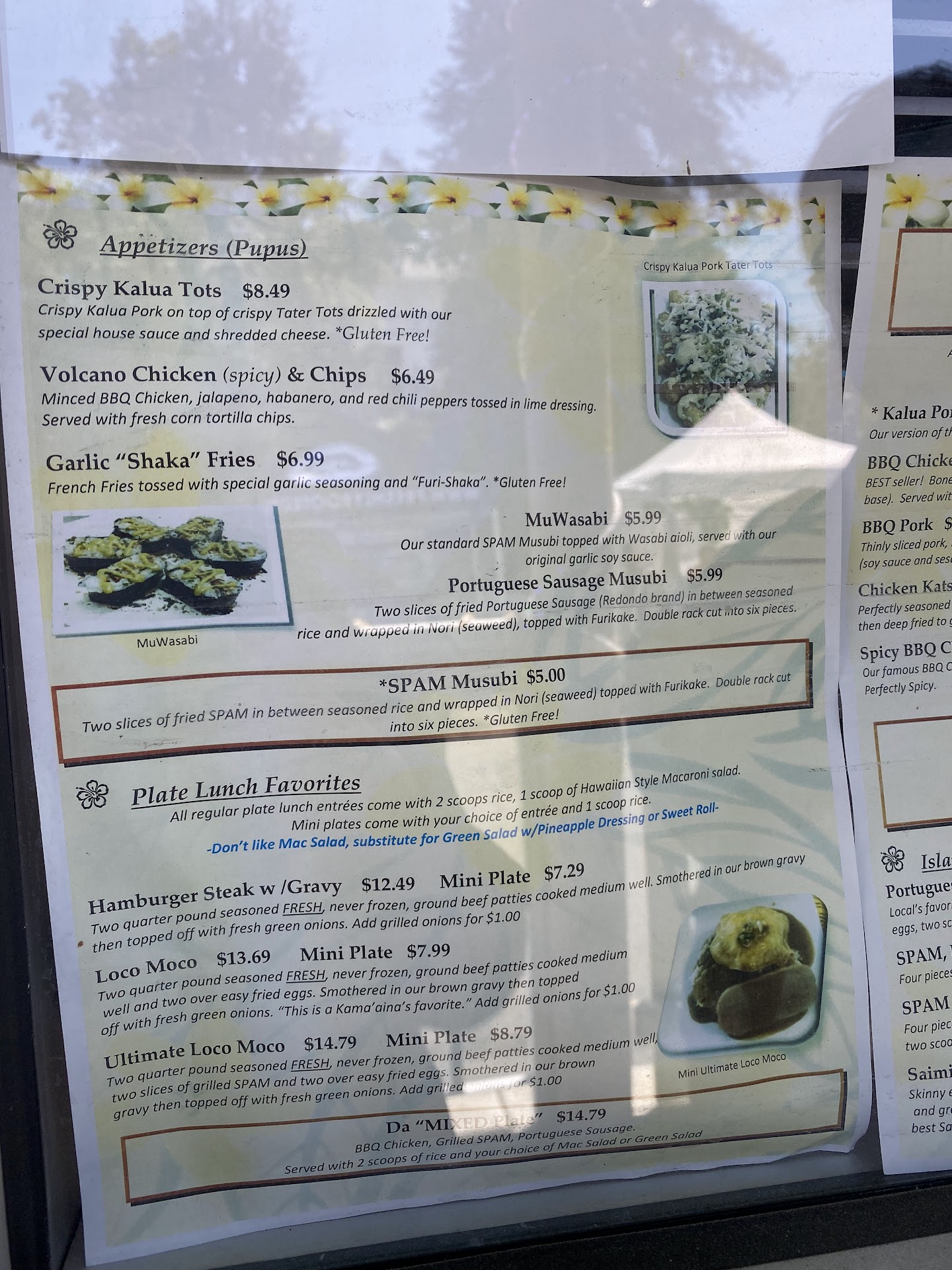 Read moreApril 14th. I didn't like having to read a menu typed with letters too small to read, which was irritating. Nothing was ever said or done to make me or my friend feel welcome. We ordered the Kahlua Pork and the Spicy BBQ Chicken plates small size. The worst was the serving size versus the pricing...one ice cream scoop of rice (rice is not that expensive to give such a small amount) and about the same with the proteins. I couldn't believe it! You get more food in a kiddie value meal at McDonald's! The Spicy BBQ Chicken was way too spicey hot! Where in Hawaii do they make food that spicey hot? It should have sat on a bed of shredded iceberg lettuce, which has a higher water content to help cool the spice. Instead, it sat on cabbage, which made the bite dry, crunchy, and weird.The L n L Hawaiian Barbeque is a place where you can get tasty Hawaiian style home cooking and...