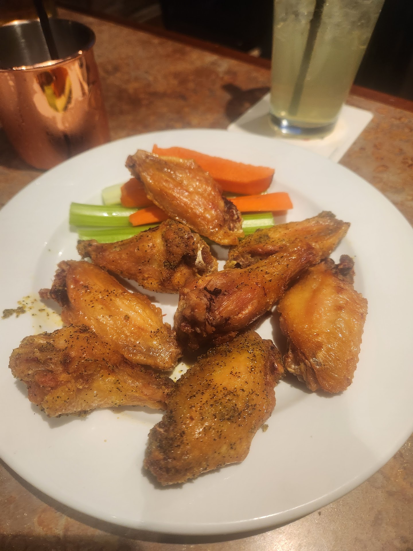 Once I finished my appointment, I joined him and his new friends and we enjoyed great food and conversation over a few beers. The chicken wings were okay ($12) but we have a couple spots closer to home I like better, a spilled glass of wine (another patron's half full glass) cost us another $7. Which, to be fair, he did spill, but accident's happen and on a $120 tab you'd think they could've just put another splash into a clean glass, imports are discounts to $4 on Tues, Bud Lights are still cheaper at $3.50. Jameson is $7.50 and delicious house-cut garlic fries are only $8.00.