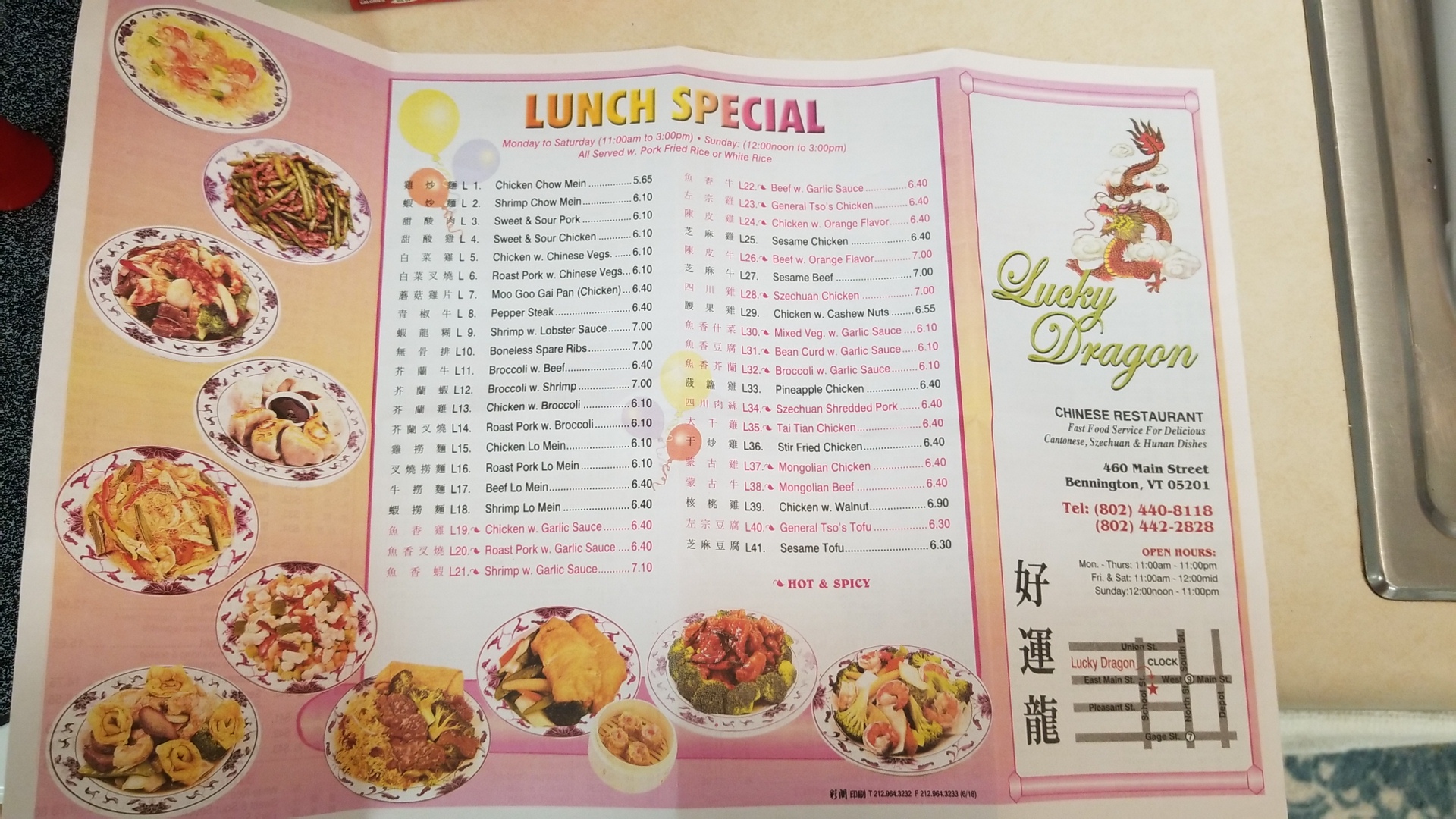 My family & I were driving around Bennington late one night. We were starving, and trying to find a restaurant. It was about 9:30 PM, & we didn't care where we ate. But, every place that we pulled into seemed to be turning off lights, putting up chairs and sweeping floors. It looked like we were going to starve on the remaining hour's drive home. But.... Suddenly....We came upon the Lucky Dragon. I got out to see how late they were open, and happily shouted "They're open until 11 PM" to my family. We parked the car, and went in. It was a cold night, and snowing hard. We had soup, lo mein, pork fried rice, egg rolls, and beef w/ broccoli. Everything was DELICIOUS!! The decor was the usual vintage Chinese, & the restaurant was clean. The people working were very pleasant, and we were served in no time at all. I have only 1 complaint, and that's the reason for the 4 star rating instead of 5. It was freezing in the restaurant on that cold winter's night. There were 2 tiny space heaters blowing from either end of the seating area....And, I believe they were the only heat source in the restaurant..on that blustery night. I ate with my hat, coat, scarf and gloves on that night. But, since everything else was great..I would like to give the restaurant the benefit of the doubt and say....perhaps their heating system suddenly broke down that night. If that was the case....I can't imagine why they remained open....But....Oh well....We still enjoyed our meal, and I would go back again (maybe this time on a warm night). ...