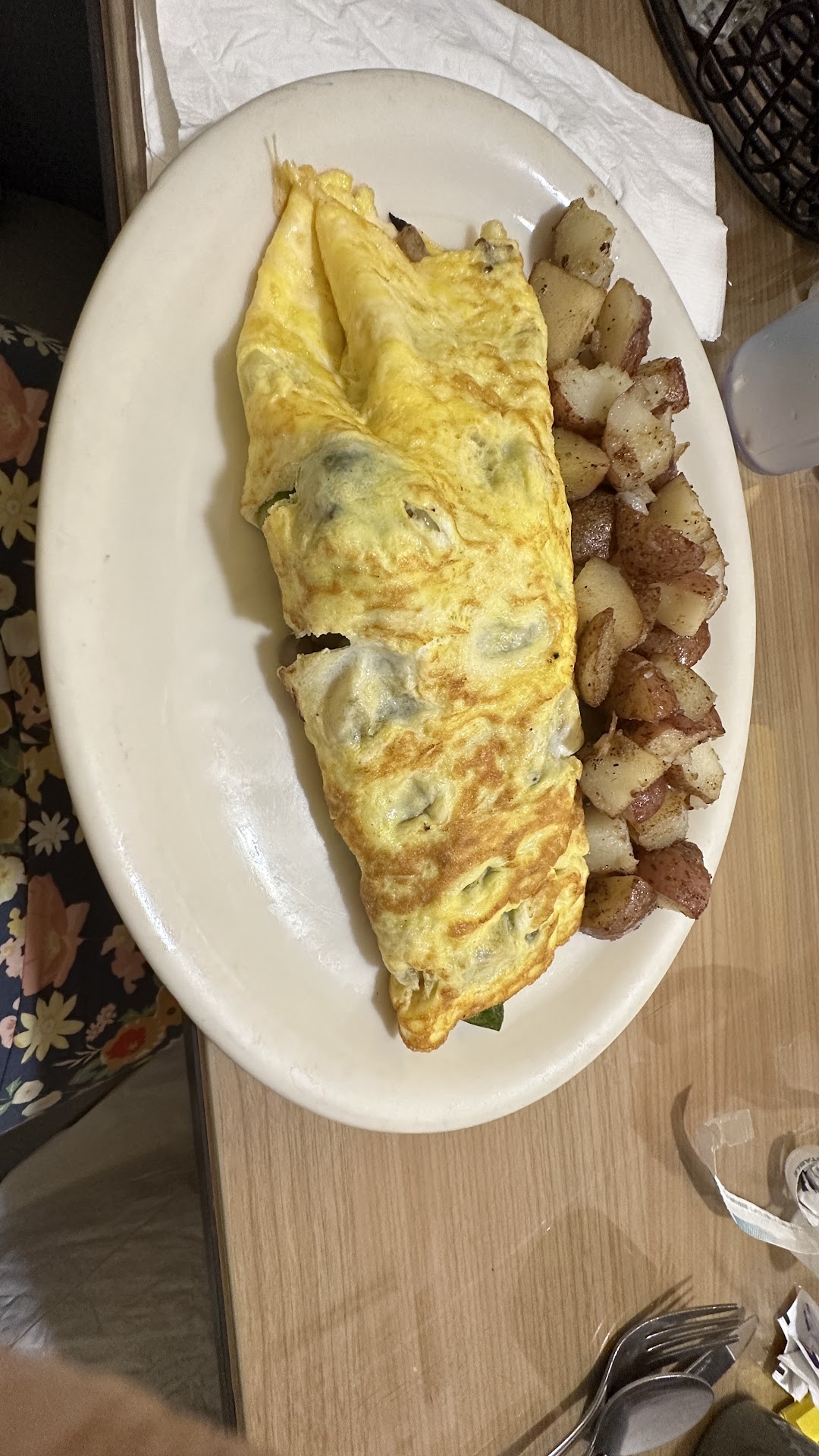 Our family, 2 adults and 3 young children, ate breakfast here this morning. Was pleased at the beginning for the ample parking. Small, cozy inside but we were seated immediately at the table in the back. They were next to the bathrooms but you couldn't tell (bathrooms were very clean also!). Our server, who was very friendly, was quick to take drink order and deliver them. When ordering food she asked if I wanted jelly or pb on my toast and it blew my mind. Never in my 30+ years of going to breakfast have I ever been asked if I wanted pb on my toast. I was so excited and of course took the pb. Food was quick and cooked as we expected.