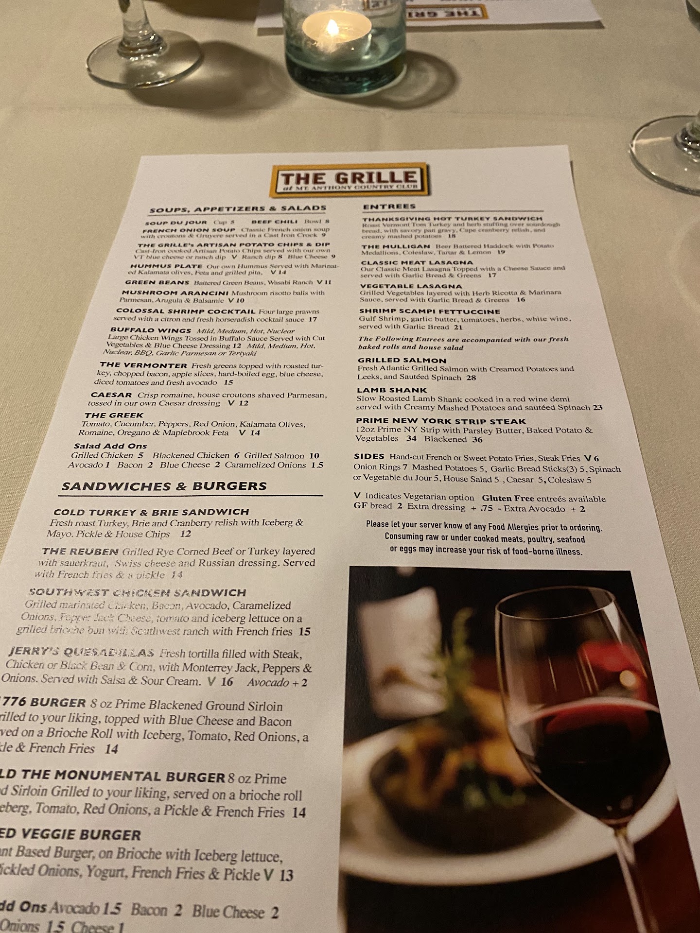Having come to Bennington for Many years... We finally decided to try the Grill at Mount Anthonys. It was a quiet Friday night, which always gives the kitchen more time to execute the food. Shrimp cocktail were great in size & cocktail sauce was spot on! The crab cakes were only food disappointment of the evening. VERY bland, as the bread filling was very pasty... Crab had to have been pureed in? Lacking any flavor... The salads were fresh & maple vinaigrette! My main entree of Apple stuffed cheddar chicken was delicious! Juicy chicken and al dente apples with a maple demi that was outstanding. The service here is very casual! PAIGE was our server and did a very good job. Its not fine dining by any means, very family oriented , casual atmosphere. Paige had great demeanor and was very positive. I dont return to many places.. I will...