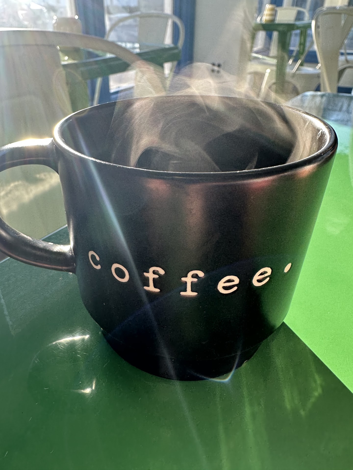 Shook, I go sit down and discover that the cinnamon in the cinnamon bun is way too thick. I can't eat it. My husband says he'll eat it. He eats everything, but not this ultra-cinnamoned cinnamon bun. So, all in all, the visit was a...