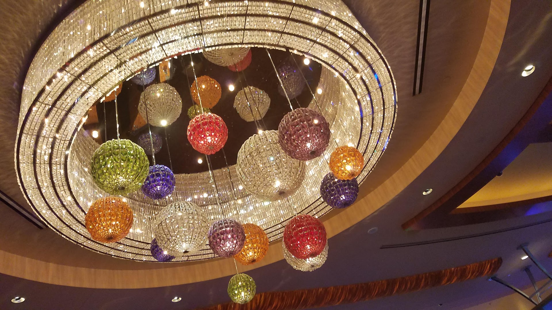 Next thing we noticed was what appeared to be Chihuly glass fixtures (image) decorating the casino ceilings. Chihuly glass is very beautiful, & very expensive; it was gorgeous. But overall it looked like the designer had perhaps gotten a lot of different things from a lot of different places & put them all inside the casino. They were lovely items, but somewhat disjointed, perhaps.