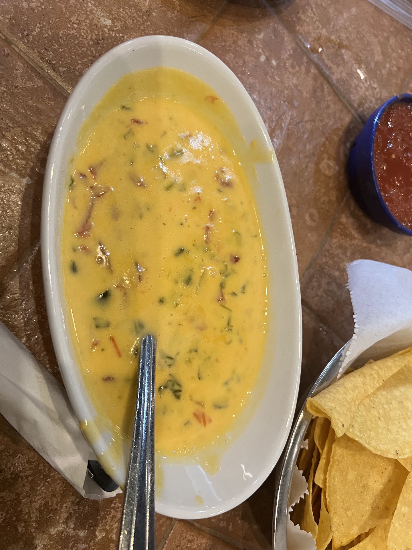 When we got to the table, the waitress took our order for drinks (soda and water). Took about 10 mins to get the drinks. Coke was completely flat and watered down, and you could visually see the change in color. She brought the chips and salsa, which were all just crumbs and undercooked. She said she would bring out another batch and never did.
