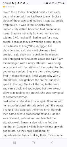 Read moreArrived at 8:49 , on the first day of Spring after dinner. Associate was outside cleaning and yelling out to customers as they arrived “ There’s no more ice’”. When I explained that the offer was until 9pm. She stated “ I’m not going to make more ice. Ice takes 30 minutes to make, I’m not going to make more “ . When I asked “why didn’t you make more at 8:30? She stated “ I did for those that were on line I’m not making anymore , I’m just not “ she later agreed that she would only extend the offer for the next day for my party of 2 and another party of 2 that arrived seconds before me. As cars arrived she continued to yell to arriving customers “ No more ice”. When asked if the offer was good the next day, they were...