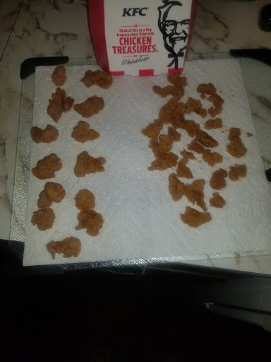 Lobby closed at 3pm so went through the drive thru around 5pm. Ordered a large popcorn chicken only. After geting it at the window drove off and stopped at the red light. Looked in the box it came in nothing but FRIED CRUMBS. So I turn around and go back through the drive thru tell them I just came through and ordered a large popcorn chicken and I will need to talk to a manager. I get to the window and tell them if they dont have any popcorn chicken ready I will sit and wait I'm not paying for crumbs. She says oh well we have some ready so she gives me some "new" popcorn chicken and says do these look better and I said yes the ones on top do. So I get home pour them out on a paper towel to see what is in the box. Well looks like they put some good ones on top of the crumbs they gave me the 1st time. Nothing but hard fried crumbs, no chicken in the middle at all!! So I took pictures of it and I will be taking them back again tomorrow its after 6pm now. So don't waist your time, money or gas going to the KFC in Benton, Arkansas go somewhere else 😡 The ones on the left actually have chicken in them the ones on the right is all fried...