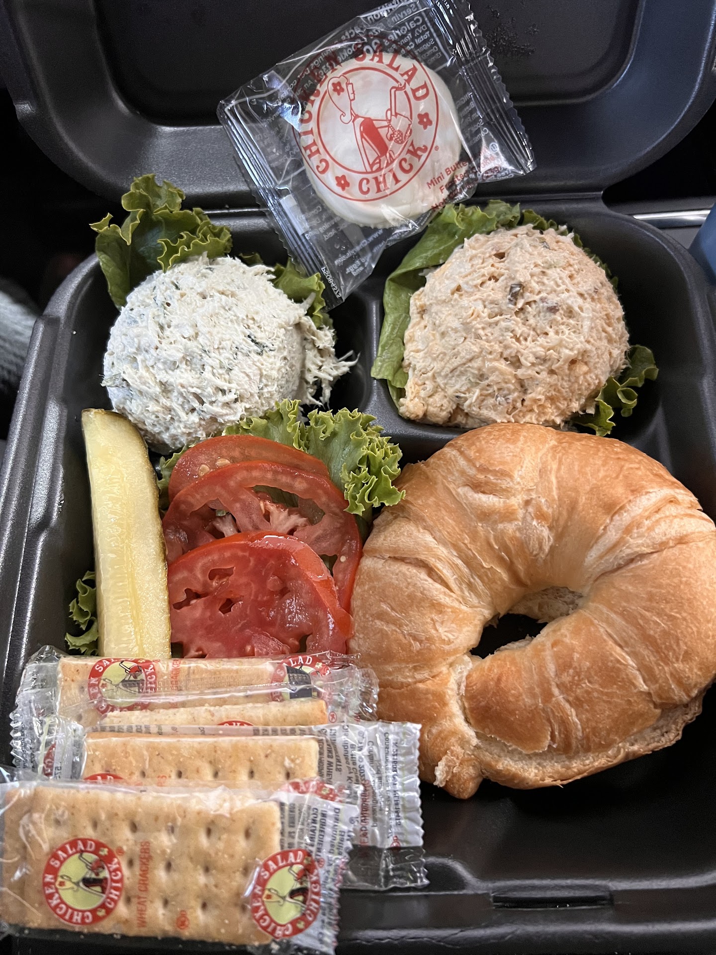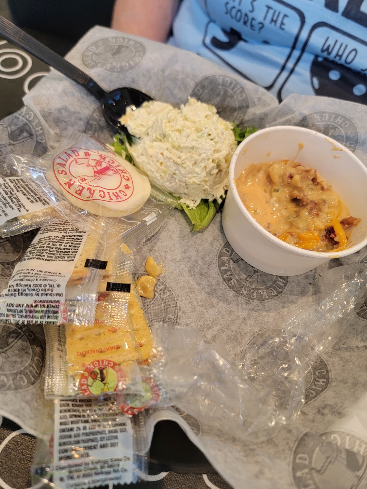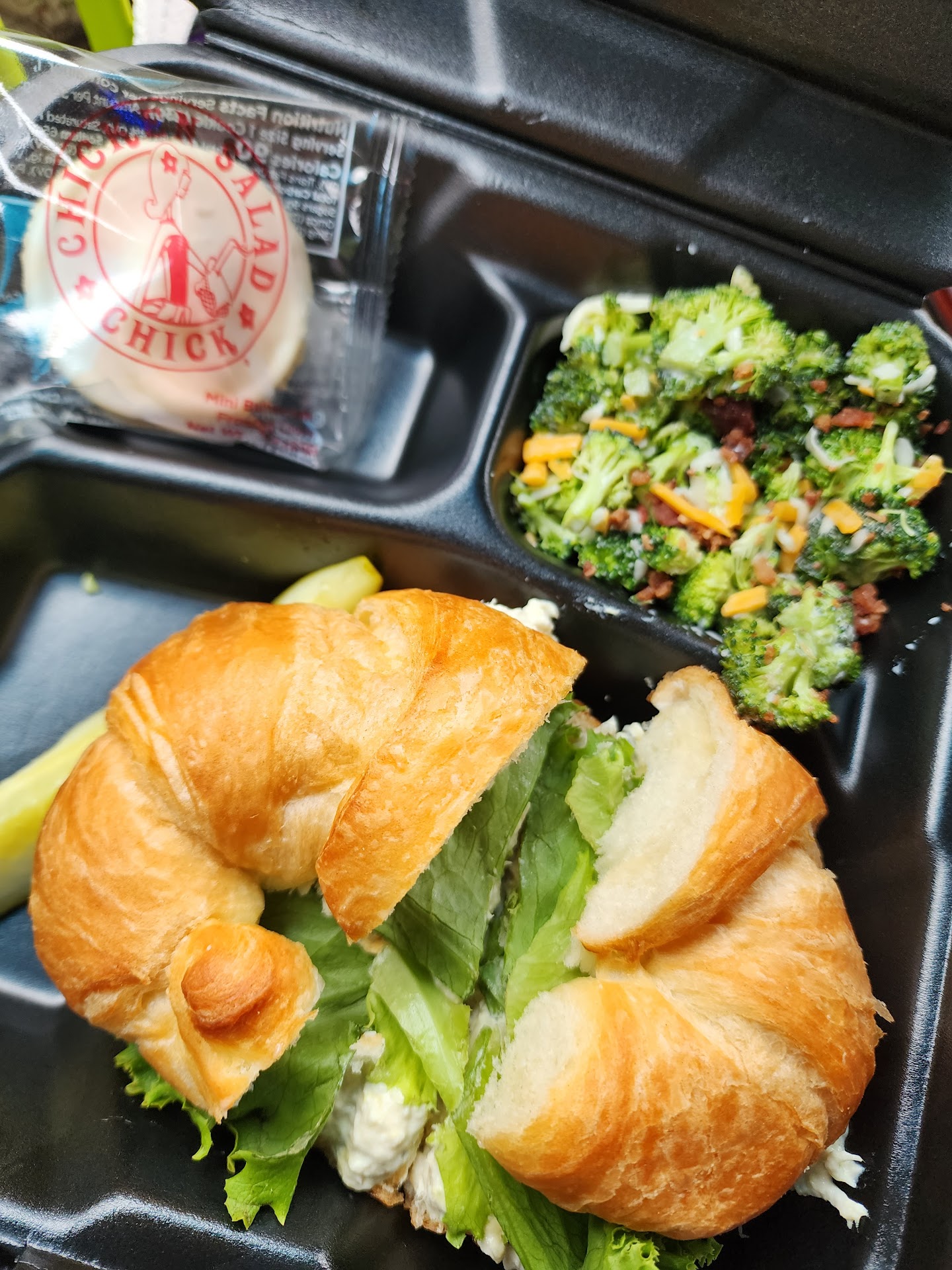 Brand new Chicken Salad Chick restaurant in Bentonville. Great location off the main road at the end of a strip mall. This location has a drive thru and a very nice covered, lighted patio out front. They have completely redone the inside (it used to be Smash Burger, I think), and it's very spacious, bright, and cozy. All the staff was very kind but counter service was extremely slow. There was a line and only one person taking orders, but the manager did eventually come out and bag togo orders and greet guests. The food was delicious as always. I got a chicken salad crossiant. I do wish they had more toppings for sandwiches like onions, pickle slices, olives, and condiments. They come with lettuce and tomato only and can sometimes be dry. We also got soup (my kids love the potato soup), broccoli salad, and pasta salad. They are all highly recommended along with the grape salad! I will be...