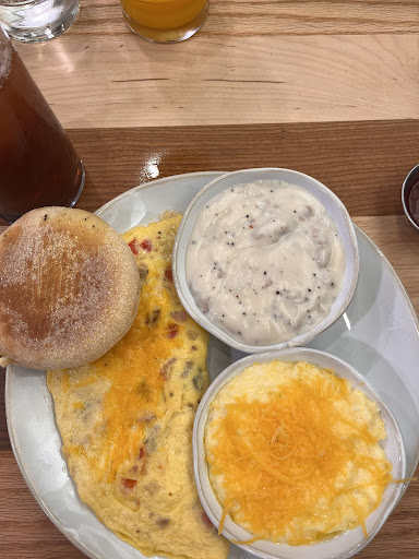 Read moreLocated on the Walmart home office campus, they have a big open restaurant with tons of comfy booths. We went on a Friday around noon and it was busy. Super loud, we could barely hear each other, it was just a general noise level, not any party in particular. I did like the menu offerings. All of the portions were on the small side. Two of us ordered an omelet called “gimme the meats”, it should have been called “hiding the meats”! It had zero bacon and maybe 8-10 pea sized pieces of sausage and ham. Quite disappointing for the cost. The gravy tasted pretty good and the cheesy grits were alright, a little thick. The English muffin was barely toasted, it actually had a cold center. Side jam was homemade and tasty. They put a pepper grinder on the table, but honestly coarse pepper on eggs isn’t good, so I’d rather have a regular shaker. Service was attentive and bathroom clean, could really use a purse hook. I wouldn’t go back, I can make better breakfast at home for a fraction and actually have...