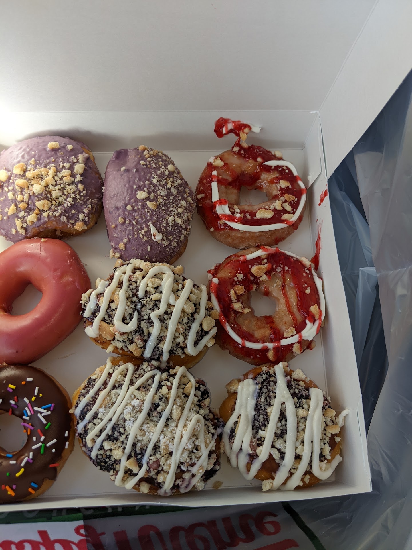 Ā Ā Ā Read moreWe live about 45 minutes from our local Krispy Kreme location, but we wanted to try the berry variety and I had a freebie for my birthday. I placed our order in the app at 6:18am to pick up at 7:45am. I arrived at the store at 7:30am, the location is still drive thru only. The gentleman at the window said he couldn't find my order and I needed to place the order again. I told him that I had the confirmation email for the order and he just walked away from the window. He came back to the window about a minute later and said he found the order but it wasn't supposed to be picked up until 7:45am and I needed to park. No issue, I knew I was early and didn't mind waiting a few minutes. He came out about 2-3 minutes later and handed me the box and said, "here you go". I immediately opened the box to make sure it was the correct order since I planned on waiting for about 10 minutes until the order time. The pictures are what we received. Terrible. Not anywhere close to Krispy Kreme quality, the box was a mess, I did not jostle them at all, the icing is terrible, we will not ever pay $14 for donuts like these again. I was not about to send them back because I couldn't be in the store to make sure the man with the poor attitude didn't do anything to the donuts, I've seen movies and news specials about what can happen when you send back food. These donuts are just sad and we were so disappointed. Gas is expensive and we drove a long way just for these. Bad customer service, these should never have...