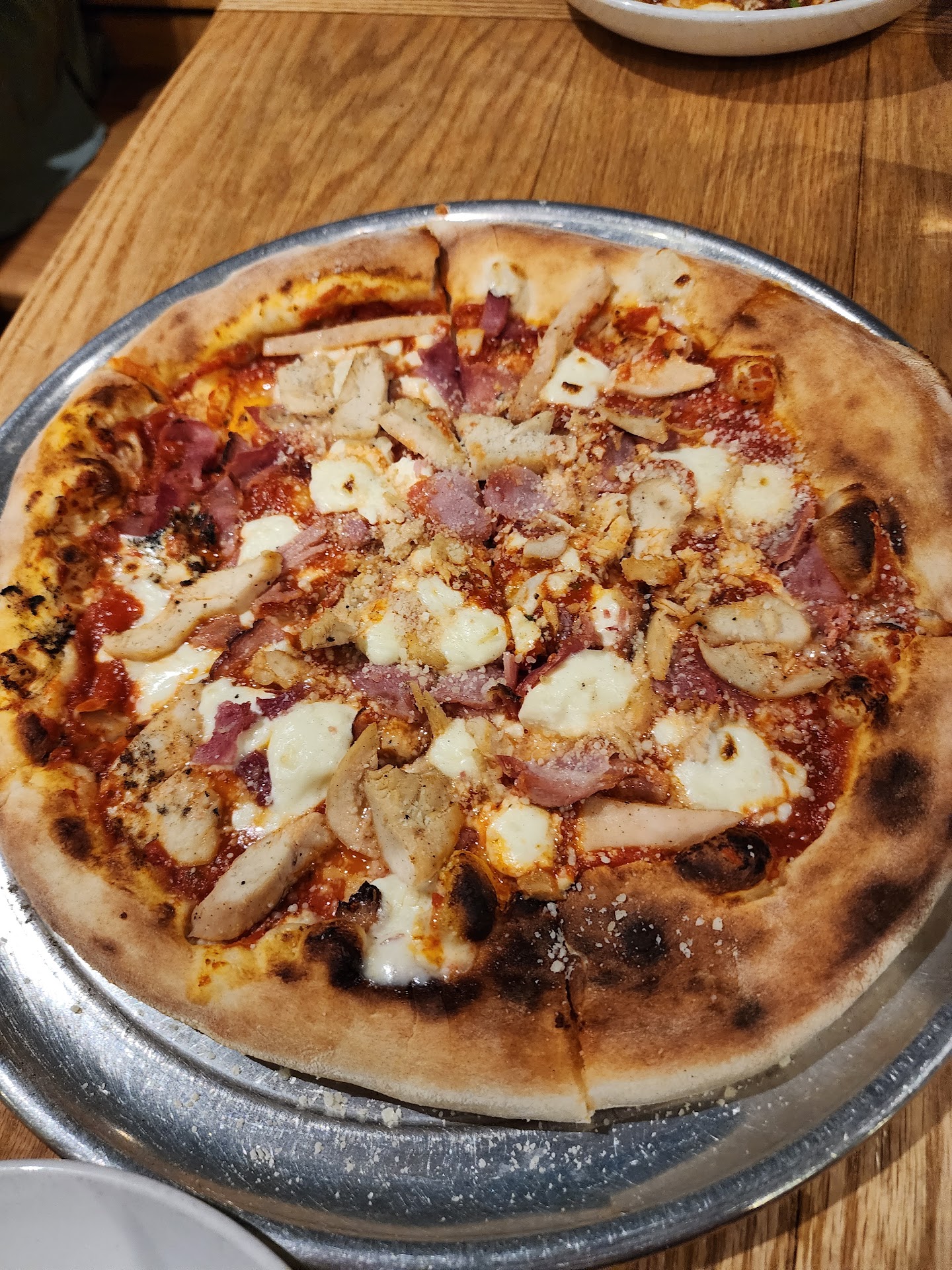 The pizza arrived and had good color and puffyness to the crust. Some nice fresh pieces of basil on the pizza (I like mine added after they come out of the oven - gives a fresher, vibrant taste). The sauce was good- simple, some acidity and sweetness that went well with the fresh basil. There was only one downside, and it's a personal taste thing - too much cheese. So much fresh mozza that it overpowers everything else on the pizza. Honestly, I think it would have been an excellent pizza with half the cheese. (It's funny - seeing some other reviews someone was complaining about not enough cheese ;) ). It's probably been adapted to local tastes.