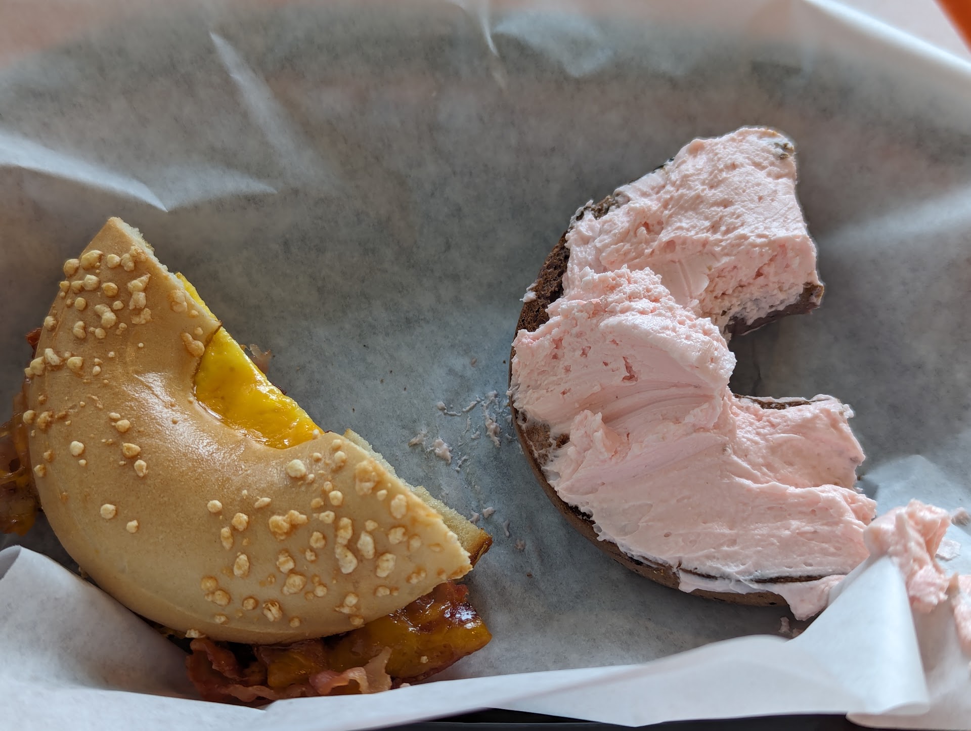 My wife decided on two bagels - a french toast and a blueberry, along with strawberry cream cheese. I got the sausage, egg, and cheese sandwich on an asiago cheese bagel. The sandwich was piping hot and put together perfectly. It was flavorful and juicy. The bagels tasted fresh and along with the cream cheese, they were awesome.