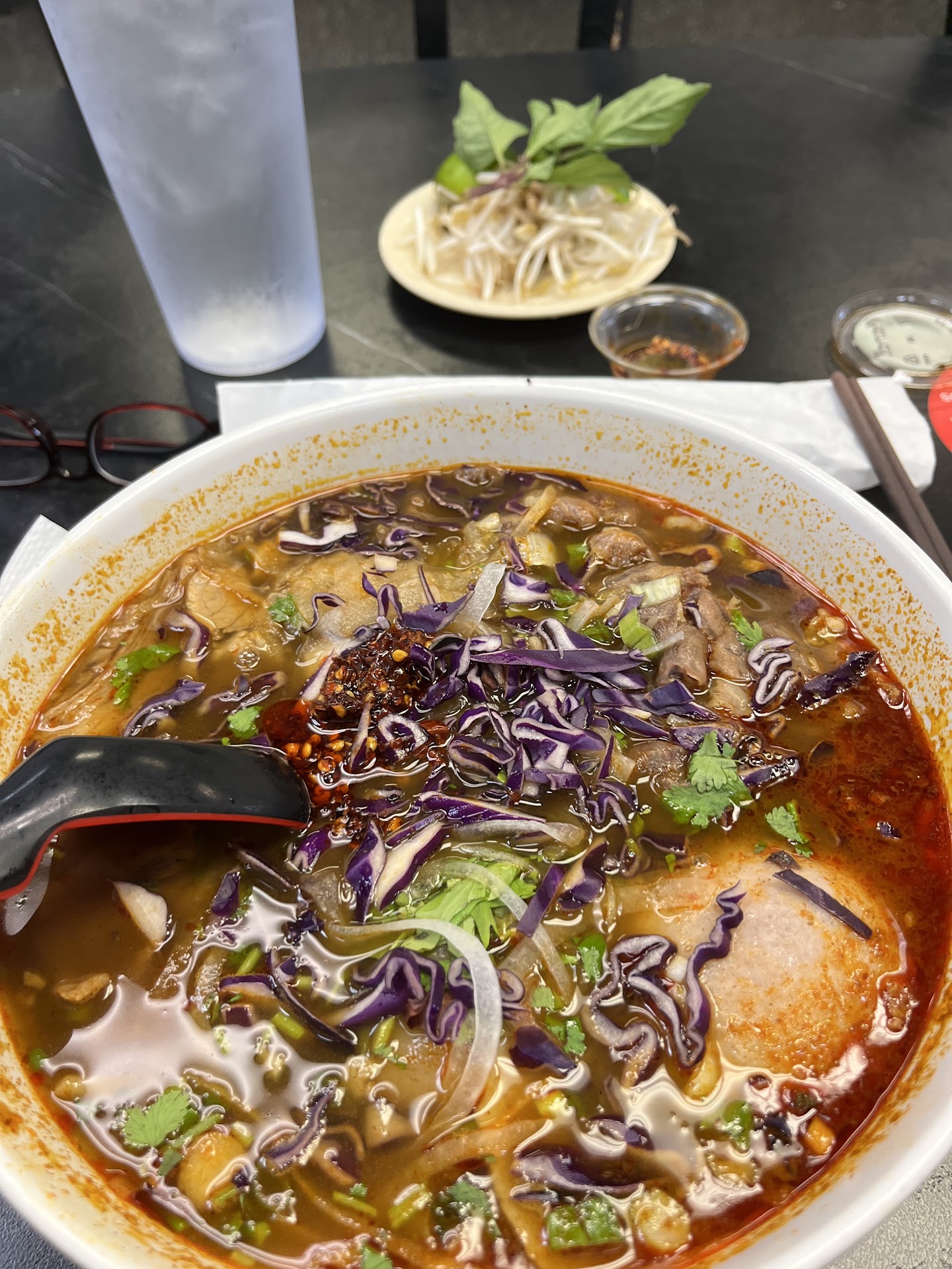 Read moreWe came here for Bun Bo Hue (spicy beef noodle) due to an excellent review on google map. When we came, there were 2 customers dining in store. We waited to be seated with 2 more customers who came to pick up their orders. There was no one at front. In the kitchen, there was a staff standing there, talking to other staff but he did not pay any attention to 4 customers waiting here (maybe it was not his job). After 5 minutes, a girl came out and told us to sit anywhere we like and gave us a menu, then she left. We waited for another 10 mins before she was back. In the meantime, there were few customers came in to pickup. There was a guy appearing at the counter. He looked around but he did not care we were so ready to order. His job is collecting the money so he didn’t care anything else. There was another guy came out from the kitchen, he took something from the shelves at the counter, he looked around, but again, he did not care we were so hungry and ready to order. There was no other customers dining in like us, except the two that were already served. Lastly, after 10 mins, the girl showed up to get the order. She apologized for the waiting but it could not reverse our disappointment. We ordered 2 bun bo and some drinks. Then another waiting time that we were so tired to count… She was back with a small dish of bean sprouts for 2 people (you can see far away in the picture is the dish of bean sprouts for 2 servings). We asked for cabbage which should be eaten with Bun Bo. They did not have it. She said it should be put in the bowl (purple cabbage). When she brought the bowls, there was a few slices of purple cabbage as a decoration only. The smell was very good but the taste was weird. Nothing tasted like bun bo except for the color. Beef, noodles, pork… everything was overcooked and too tendered. However the chili oil was very spicy, that helped us finishing the bowl. It was a bad experience from the food, service to atmosphere. With the same price, we can get bun bo at the other place nearby in such a more quantity and quality dish and much better service in such a shorter...