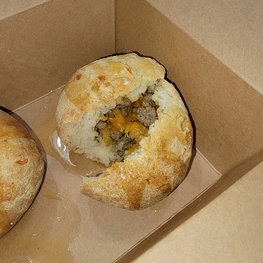 A+, no frills, just great eats joint! I got 2 cinnamon rolls and 2 breakfast bombs as they were coming out of the oven at 7am. this morning. I would've told her to hold the honey drizzled over the breakfast bombs but found it to be a fabulous compliment to the cheese and sausage inside. The bread was soft, not chewy, which I've found to be common w gluten-free breads. She boxes them in a convenient brown non-wax box, which is perfect for toting to work, +1 for using very little plastic. The cinnamon rolls are next level. Moist throughout, not too sweet, but FULL of flavor. That glaze frosting is so good. They are served in a cute individual bun container w a plastic recyclable lid, making it convenient to tote to work without losing half the frosting to the cover like most places. The baker was quick to greet with a smile and very kind. She explained her offerings without overwhelming me as I'm fairly new to gluten-free products and even told me what she had coming out of the oven next. I couldn't finish a breakfast bomb and cinnamon roll in one sitting, and I began the meal starving from a 20-hour fast. A worthy NON-CONGLOMERATE shop conveniently located adjacent to BeefoBradys. Highly...