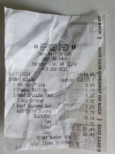 Read moreWent by there Friday night, I had ordered on the app, waited over an hour in line to find out they were out of Beef... There were at least 10 cars behind us. If you were out of Beef why did you let me order, take my money, and make us wait a freaking HOUR to be told there's NOTHING they can do.. You're open until 4am. . . What the heck were you going to do until 4AM?!? Wasn't offered anything to exchange it, I was actually told by the guy working the speaker "He was gonna let me in on a little secret, they only have 3 people working and went on a rant" Again, NOT the issue... Then a manager "Dashawn" (If you'd call him that) took over to still not offer anything in exchange for the items that had beef, That I can just cancel my order on the app.. Which clearly we tried to do well before we got to the window because of the line. Then they marked my order that we picked it up?!? WHAAAAT.. We couldn't get our 41 DOLLAR ORDER because TACO BELL WAS OUT OF BEEF!!! Still NO REFUND and NEVER got our food! Whoever owns this location should be EMBARRASSED for your lack of customer service, your poorly managed employees, and stealing from your customers! Good luck calling the customer service #, No one answers the line.