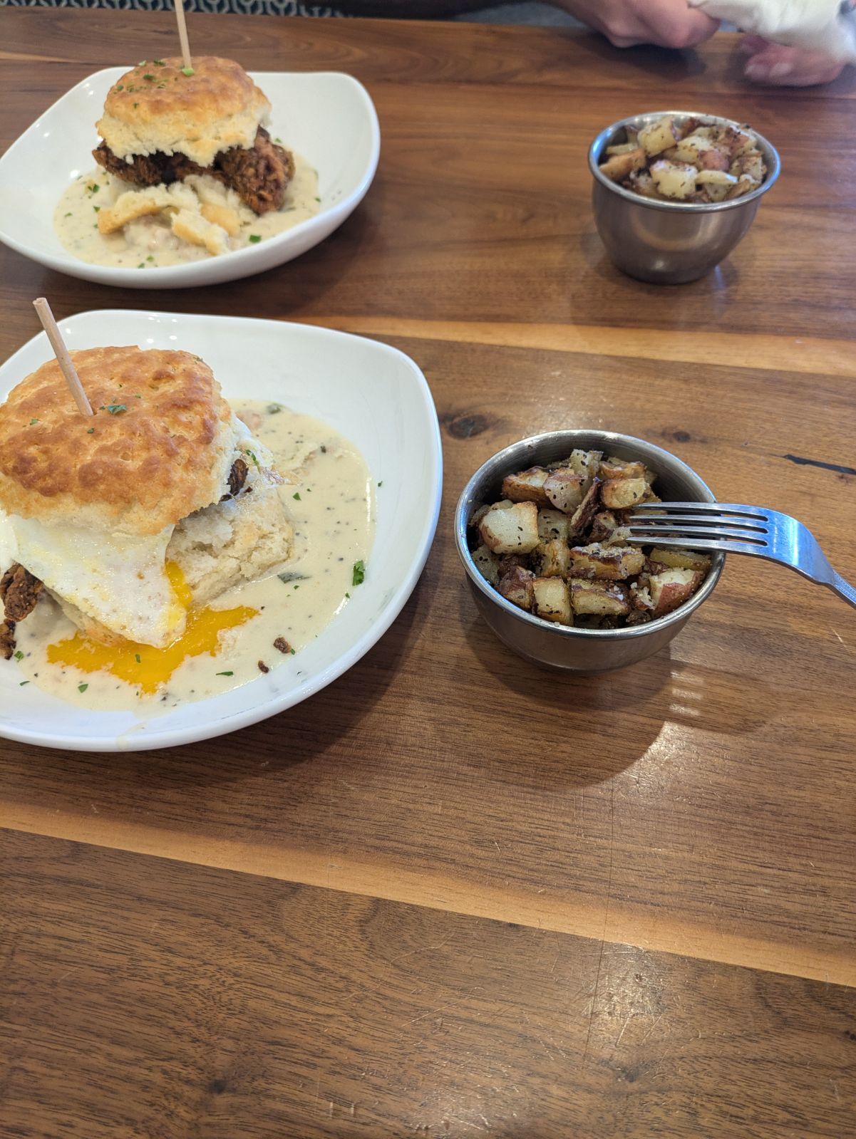 Read moreThe Gentlemen in the front of this location while I was here for breakfast were great. They seem to be very personable and happy to be there, over all excellent hosts. That was the start of this life changeing breakfast experience. They have a great variety of stuff to choose from, most are fancy-ed up variations of staple breakfast options. I was not on the "best stomach" this morning so I opted for the Winston with an over easy egg. We can start with the side of potatoes, good cook on them with mouth wateringly good seasoning. Slighty crispy. The Bisket of their name sake was literally out of this world good! So moist and warm with beautifuly lightly seasoned, takes you to the last place you had REAL homemade (with love ) Bisket! Grandma's come to mind! The fryed chicken was most definitely pan fryed in a cast iorn skillet by the amazing crisp of the thick coating and the tenderness of the chicken. Or maby they use magic.. the gravy literally filled the cracks in my soul. And the egg added such richness to the whole affair!