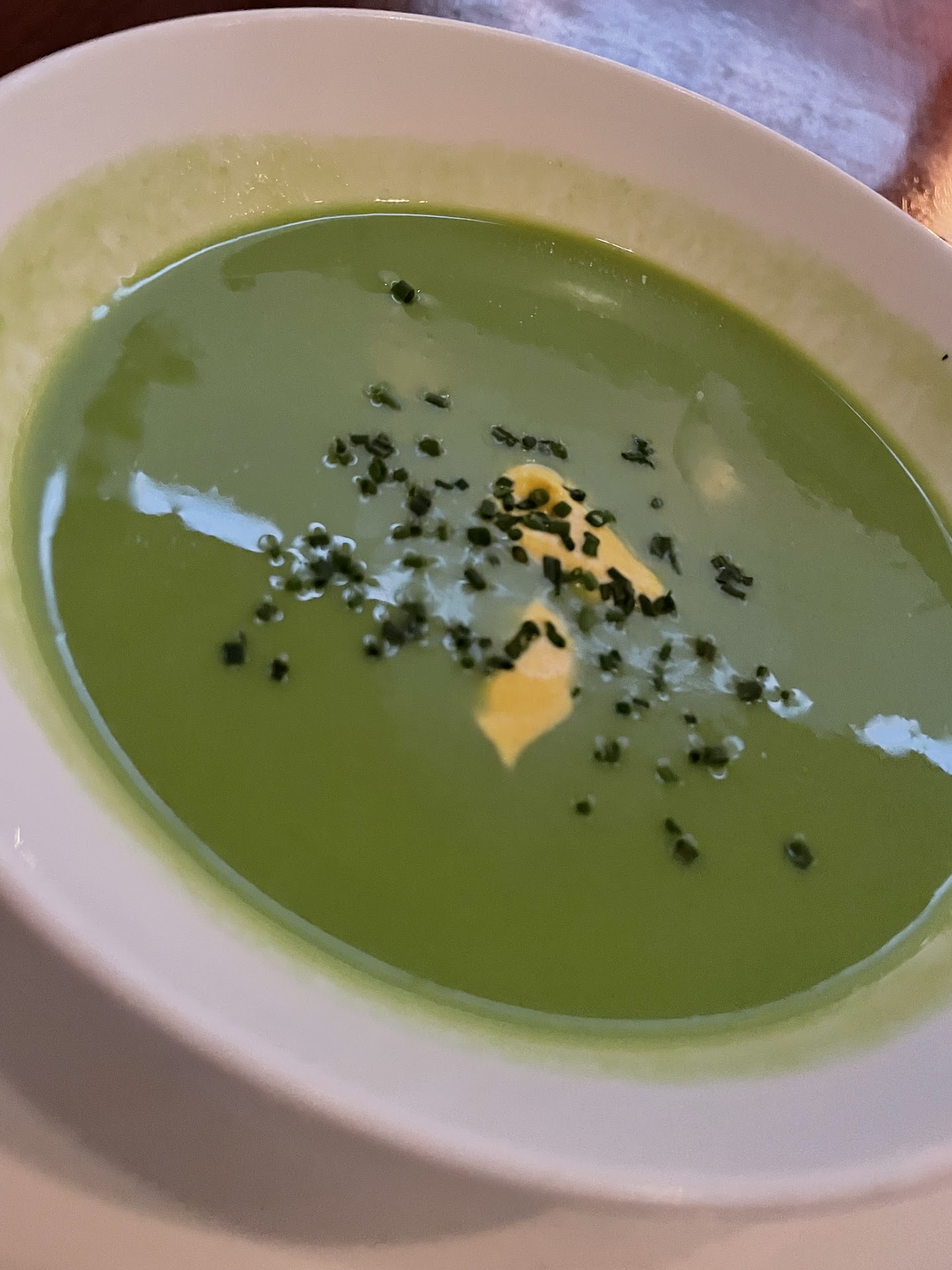 Next was the Chilled Spring Pea Soup balanced with turmeric crème fraiche and chive that was exceptional. The consistency was perfect, flavors subtle but very refreshing and was a fantastic start to the meal. I was a bit nervous due to the redundancy of peas in my meal that I ordered but I’m very glad I chose this. Came out at the same time as some cornbread and sorghum butter that was also very simple but a great palette cleanser/starter.
