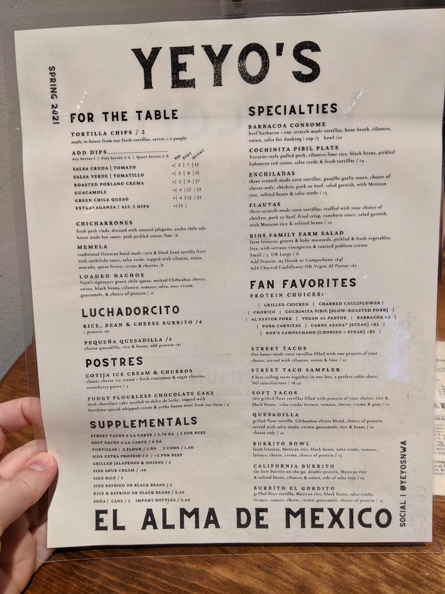 As we were putting in our drink orders she also asked if we were ready to order despite not even having time to look at the menu so we kindly asked for a few more minutes. I had been to yeyos about 6 times before the remodel and had excellent service in the past, though the price was higher I was willing to spend more given the portions and quality. After glancing over the menu i noticed some minor changes including a small uptick in price. Again had the food been better the price would not have seemed so tremendous. We both order the street taco plate that came with three tacos rice and beans and decided on carne asada which came topped with onion and cilantro and a green salsa, very standard. The tacos are small with minuscule amount of meat, with the rice and beans also being relatively small. We brushed it off as we understood the company had a farm to table approach meaning there was an expectation to quality over quantity however I personally feel as if the quality of the food was unrealistic to the price.