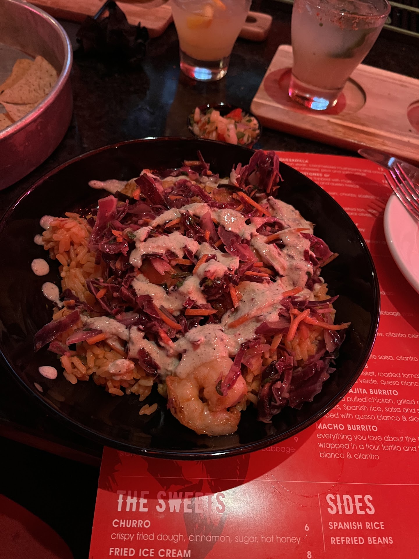 The Atmosphere is nice with the red and black branding from the logo, to the decor, to the napkins. The Mural is the back would make a great tattoo. They could benefit from kind of fans though. There was no circulation and we were sweating before our...