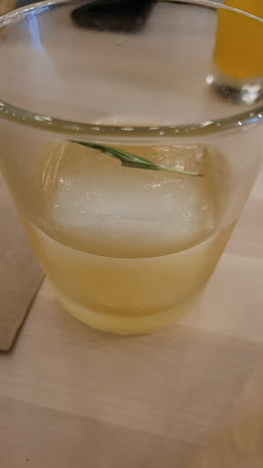 I sampled a cocktail called the Night Hawk. It was made with Old Forester bourbon, honey, rosemary, and lemon. The drink is served in a chilled rocks glass overtop a square ice cube. You can smell the honey right away with a hint of the rosemary, but the drink is not very sweet. The lemon is very forward and the bourbon is hidden until the end, coupled with the honey it adds a slight bite to the drink.