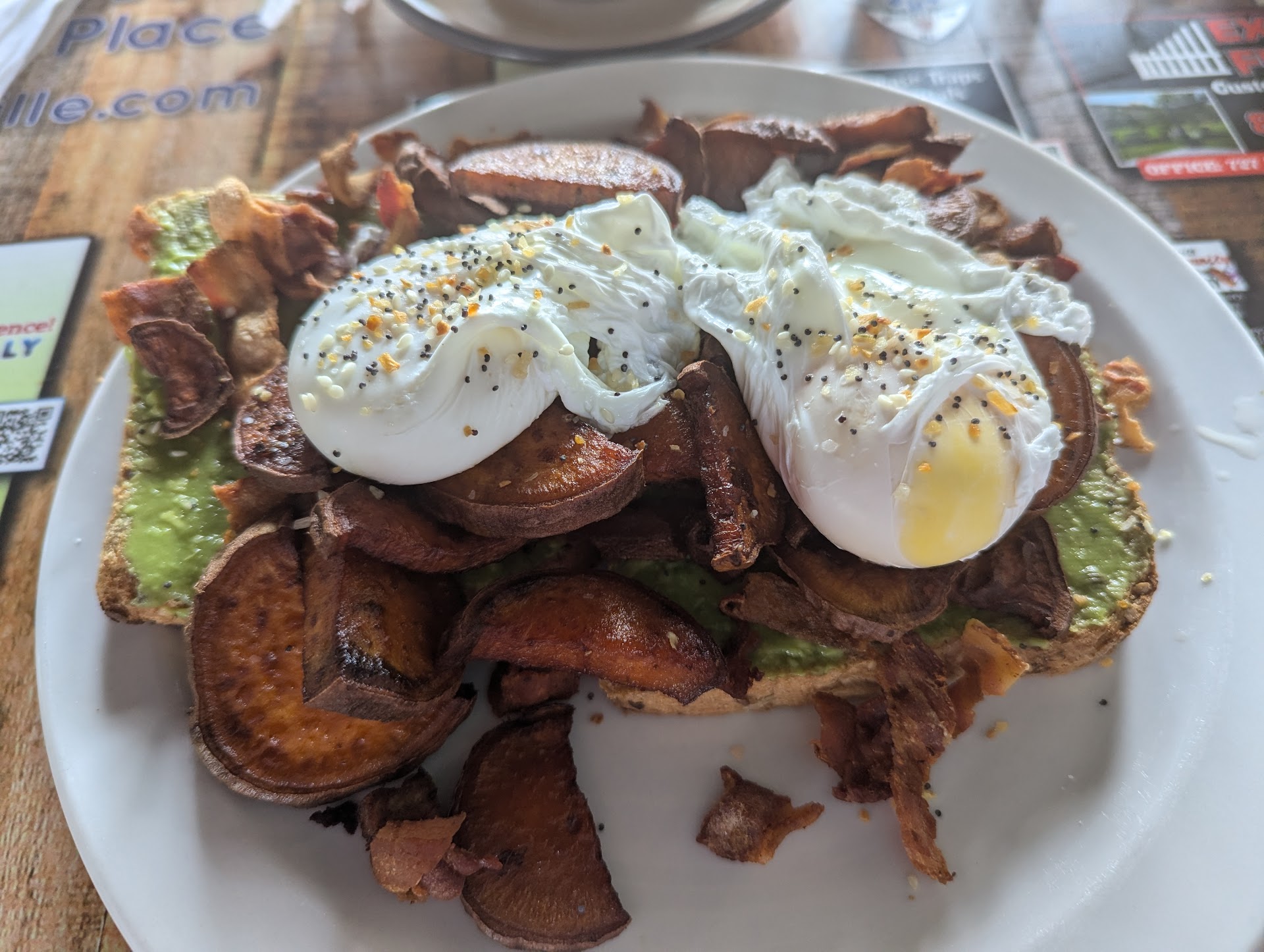 I'd already been pretty naughty on vacation so I decided to slightly rein it in with the avocado section of the menu (hot take - all brunchy establishments should have one) and opted for the Glazed Over, featuring avocado toast, poached eggs, bacon and sweet potatoes (bypassing the balsamic glaze, which I guess just makes it an Over). I'm still on the fence with this one. It was a HUGE portion, and I like all of the ingredients involved but I'm not sure it ultimately goes together. Love the egg and avocado toast together, but the piles of sweet potatoes and bacon I think were a little too much, at least for me. Also (and I probably should have realized this beforehand) this is NOT the type of dish to bring home for leftovers. I completely forgot that avocado has zero staying power so the next morning I did not have the freshest bite of this. That's on me, but in hindsight I would have gone for something lighter that didn't have as many ingredients - you're basically cancelling out the benefits of the avocado when you douse it with bacon. But in the moment, it WAS good, I can't say it wasn't.