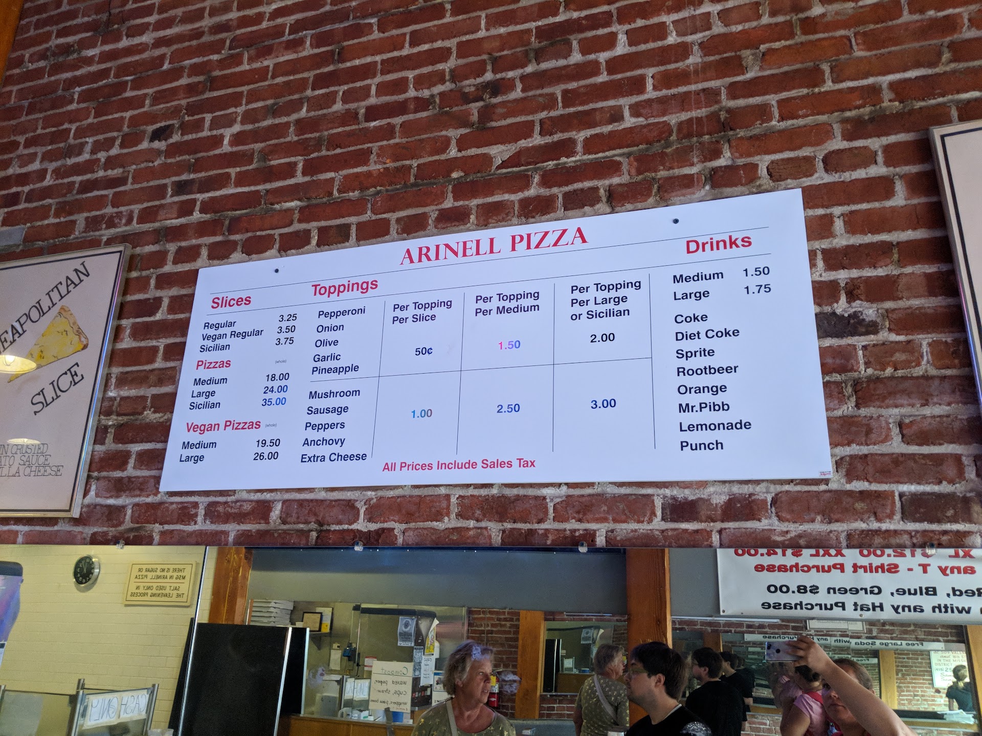 My wife and I have been eating pizza at Arinell's since 1979. My mother use to buy me a slice of pizza when I was a kid while we were waiting for the shuttle to take us to UC Berkeley. For this reason, I use to ask my mom if I could go to school with her, just to get a slice of pizza. Come to find out, my wife use to eat here when she was a kid as well. It was her favorite place to eat pizza. The bad news is, the prices have gotten out of control. It's five dollars for one slice of pizza and $36 dollars for a large cheese pizza. We enjoyed going there so much, that all four of our kids have become fans. Every time we went, we purchased two large pies. I'm sorry to say, $36 is a bit much and my wife and I sadly agree that we will no longer eat at Arinell. It saddens me to say that, being it held a special place in my heart because of the memories I have going with my mother, who is no longer with međȘ. In any case, thank you for the wonderful years I've shared with my...