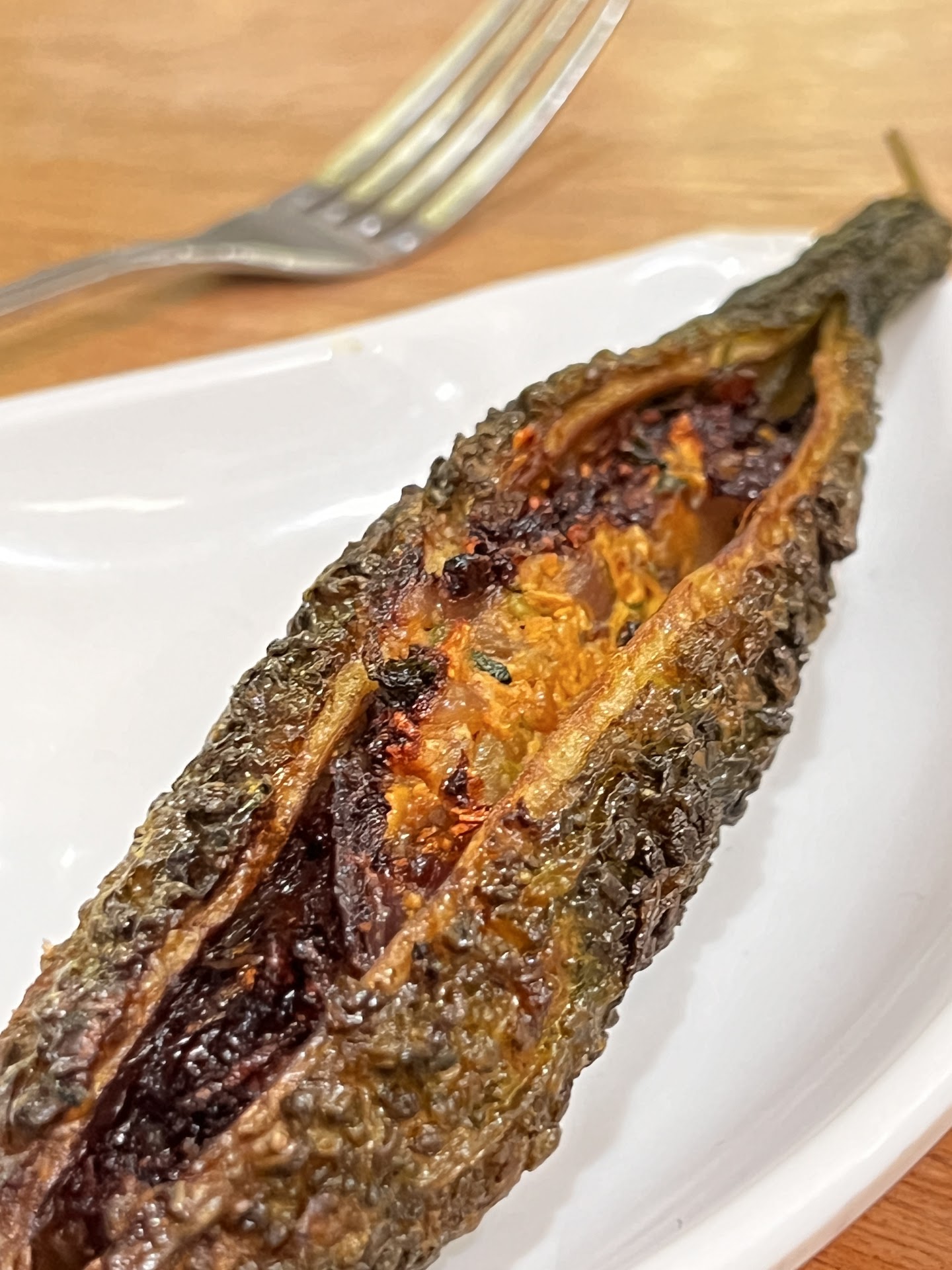 First of all, the menu is outstanding. There are dishes that you will never find on the menu of any other restaurant. We had Chicken Paratha Fold, Masaledar Bharwa Karela (bitter melon; literally as good as my mom’s, but it’s an acquired taste), and Kori Gasi (a south Indian chicken curry). Everything was outstanding (except for one small thing: the paratha did not appear to be fresh). I loved the attention to detail in everything else. They have the very best green chutney (cilantro-mint) and red chutney (tamarind) I have ever eaten in any Indian restaurant in the US (and I’ve lived here more than 40 years).