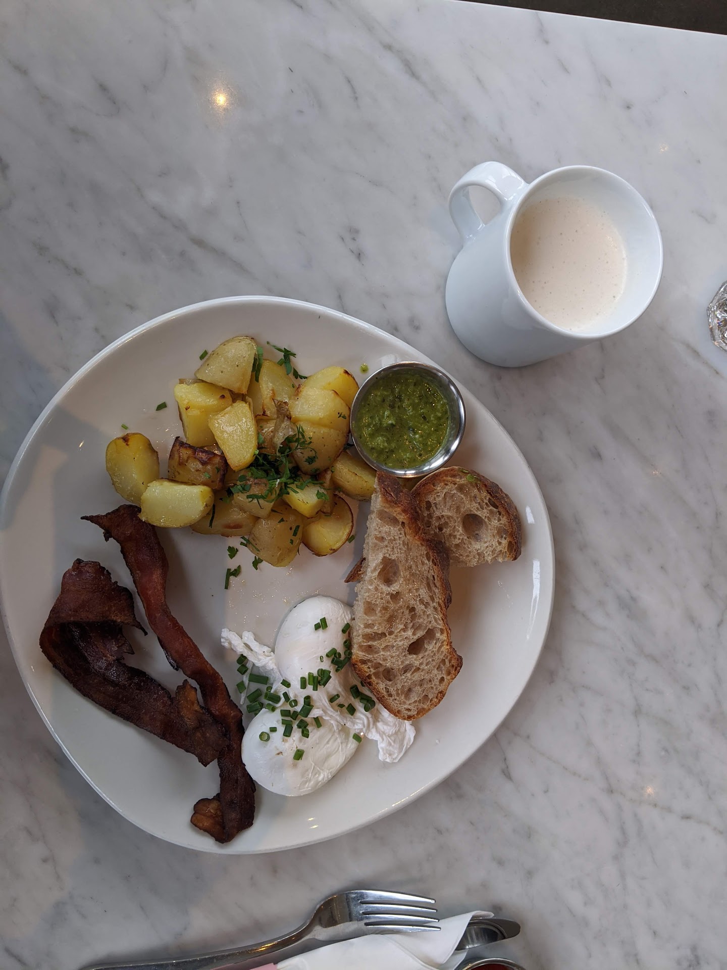 Onto my order I got the breakfast burrito with bacon and a macchiato. The burrito had a nice spice to it with the salsa inside and I had an additional sauce to put on top that was super yummy. The bacon was a bit sparse though. It had large wedges of potatoes inside that took up most of the space so I only got a couple bites of bacon on the side. Regardless it was a nice meal.