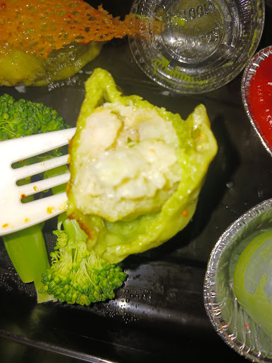 Seafood gyoza $15.50 6 pieces 2/5 Pan fried seafood dumplings Shrimp, scallop and ground fish meat. It had a mild spicy kick and lemon grass reminiscent of Tom yum soup. Taste wise it was good. I bit down on something hard and found shrimp shell inside my gyoza. The shrimp was cooked more than the hao gow and was a little chewy.