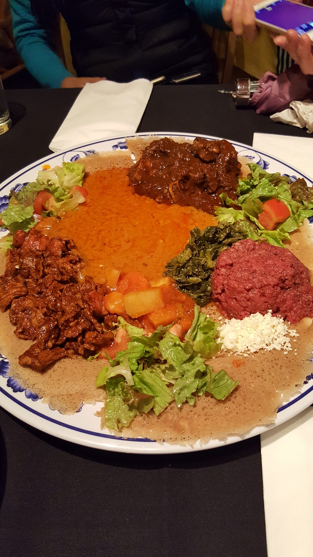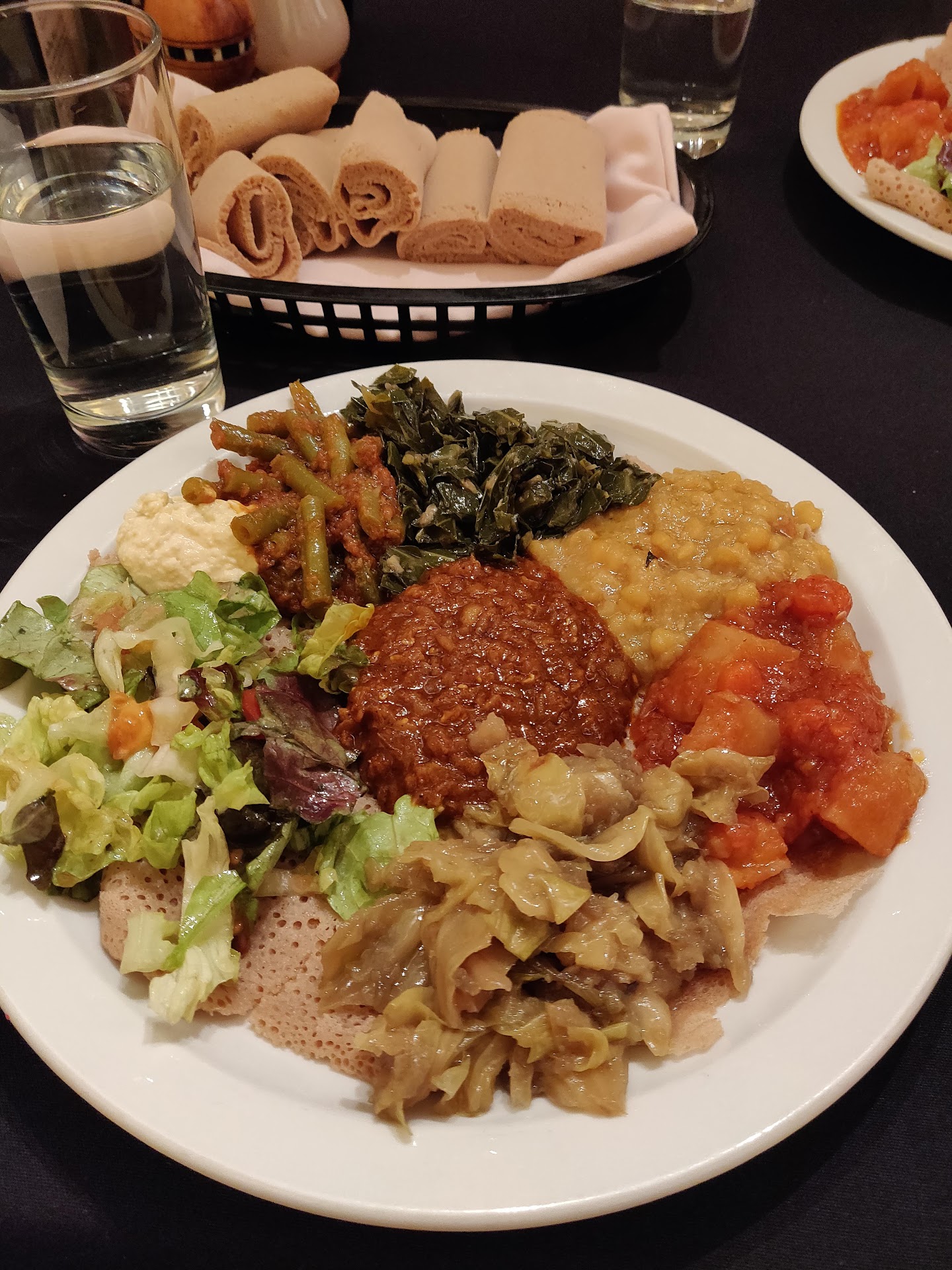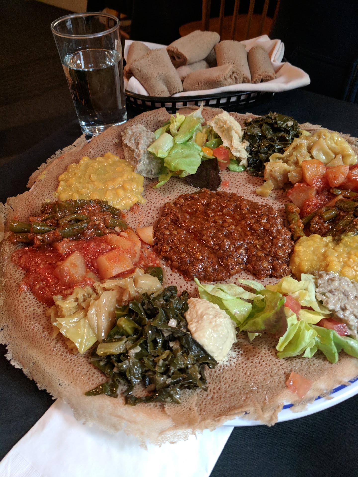 I had only had Ethiopian food once years ago and never experienced the whole eat-with-your-hands thing. We had the vegetarian platter (roughly $15) and a spicy lamb dish that my husband swore was called "bed wet" (I think around $15 as well). Both came on a large platter we shared with a basket of injera - spongy, crepe-like sourdough bread that you used to scoop up the food.