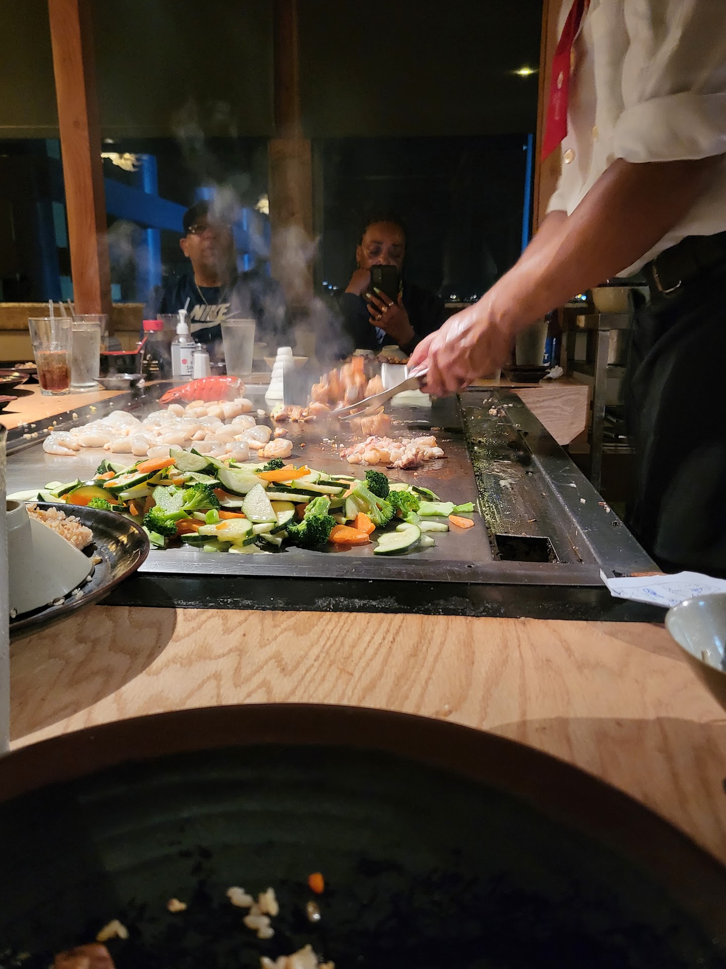 We showed up for our 6:30 reservation and was seated at the grill table even though we did not ask for it. By 7:00, I went to the front to ask where our server was. I should have trusted my instincts and left but said it was an experience I should give a try. The young host at the front acted like he was surprised caused he assumed we wanted the grill table. I explained that we just wanted to order so he said we could move to the tables by the bar if we prefer and moved we did. We picked up our water, menu and whatever patience we had left and got ourselves a table by the bar. Interesting enough, the bartender took our order within 5 minutes. We ordered the hibachi dinner of ribeye steak, jumbo shrimp and salmon and a beer. By the time we got our food, I was telling myself that I would never ever return to this place. I canāt think of what to describe regarding the food because it was just that. I think the chef or whoever was cooking in the kitchen had a bottle of salt, bottle of pepper, butter and some lemon wedges to work with. All three dishes tasted the same in terms saltiness, grease and sourness. Veggies were soaked in oil and overcooked. Thank god the lights were dimmed because I canāt imagine how dirty the place was if it was bright. Decorations were from the 80s and the place smelled of wet and old carpet. Our bill totaled $112 with $16 tips. After reading other reviews, everything made sense, why we were seated at the grill table instead of the few empty tables by the bar. Any person seated at the grill table was charged the extra 18% gratuity for the chef on top of your tips. Since there were only 3 of us, we had to wait until our table fills up before a chef shows up. Hence, we were left sitting there without a server from 6:30 to 7:00pm. The host who initially acted like he was sorry for the mixup was a weasel who knew exactly what he was doing. He was following the establishment protocol which was to fill up the grill tables regardless. They really should explain to customers the difference and let the customers decide where to sit. The whole thing feels dirty. One star to get this...