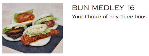 I had ordered the Bun Medley (1 Shrimp, 2 Chicken) because the menu photo showed the buns covered in a red sauceâsimilar to the saucy nuggets at Wendyâs which is exactly the reason why I ordered it.