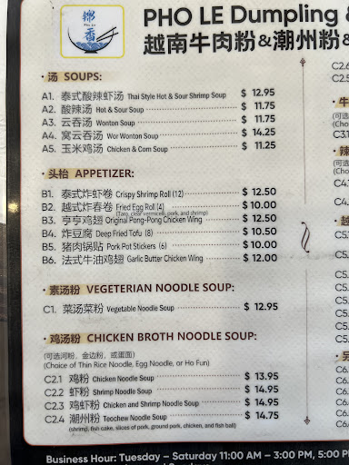 Came here on a hot, quiet Tuesday last week and had a most enjoyable experience. The man serving us was super friendly and the food was delicious. We ordered a Pho Dac Biet, Pho Ga, and also tried the house special dumplings. This restaurant has a sort of Chinese/ Vietnamese fusion menu, but certainly everything we had exceeded expectations. The broth on the Pho Ga was crisp, the beef broth was rich and flavorful, and the additions and sauces provided to enjoy a variety of dining options was plenty. One thing I was surprised by was the quality and presentation of the dumplings. They included a 3 sauce set and the wraps were filled to the brim. All the food cost us probably around $30 and was worth every penny. I have been dreaming about coming back to Pho Le in the...