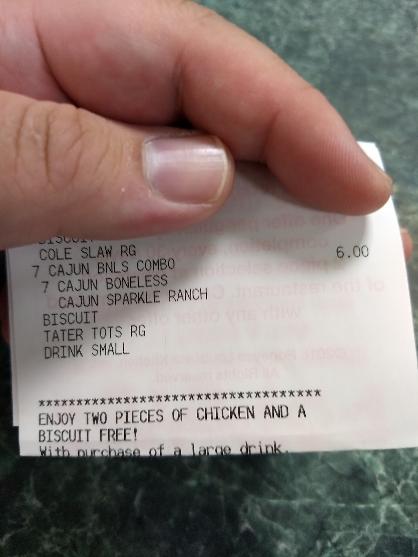 Read moreThis one has gone downhill. I don't know if it's all Popeyes or just this one, but they stopped doing dinners and only do combos here. (Dinners are your entree, one side and a biscuit, while Combos come with that and a drink usually a $1 more then a dinner). But they only do combos so you have to have a drink. But the last time I went I got the special advertised item they got which is usually $5 for the dinner and $6 for the combo, because they only do combos I got the $6 opinion but they didn't give me a drink saying that it didn't come with a drink even though they charged me the combo price and my receipt said combo and had a small drink included. They said that it not supposed to come with a drink but because they don't do dinners anymore they have to charge me the combo price but not give me a drink. The picture they advised even had a drink with the meal and the receipt said it comes with a drink. I spent like 10 mins trying to explain that I should either get a drink or be charged for a dinner before giving up and just leaving...