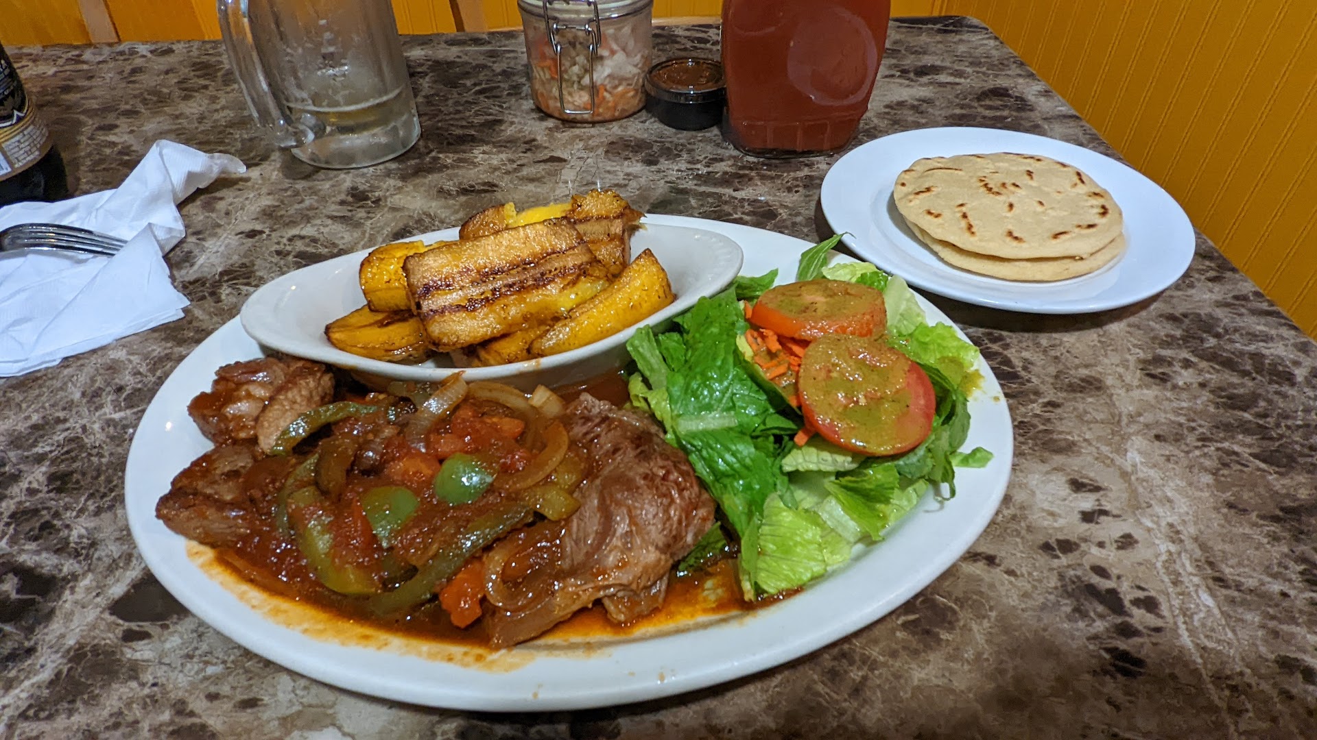 We were also given two complimentary containers of curtido and two bottles of red sauce, which we really appreciated. They didnât charge us for either, and both were flavorful and authentic.