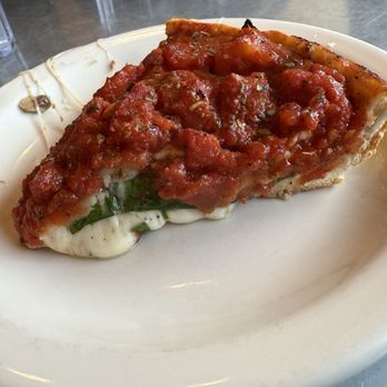 For me and my parents, we got a regular sized Greek salad and a medium spinach and mushroom stuffed pizza. The Greek salad had some kind of orange dressing on it, I think it was roasted red pepper. It was delicious, actually, but I could have used more salad, and I was surprised at the size of it for something that was "regular" size knowing that there was a smaller option. The pizza was well flavored but the structure was a bit off. It wasn't as deeply stuffed as I'm used to with Chicago style pizza, and the sauce was really watery. There was a puddle on my plate when I was done eating, as well as one in the middle of the pizza pie! That said, the sauce was very herb forward, which I appreciated, and I loved the big chunks of tomato that made it clear the sauce was homemade. The cheese was perfectly stringy as the pizza was served to us, though the pie could have used more mushrooms as well as more spinach. The spinach that was there was bright green, as opposed to overly wilted, and the crust was crunchy and held up surprisingly well to the watery sauce.