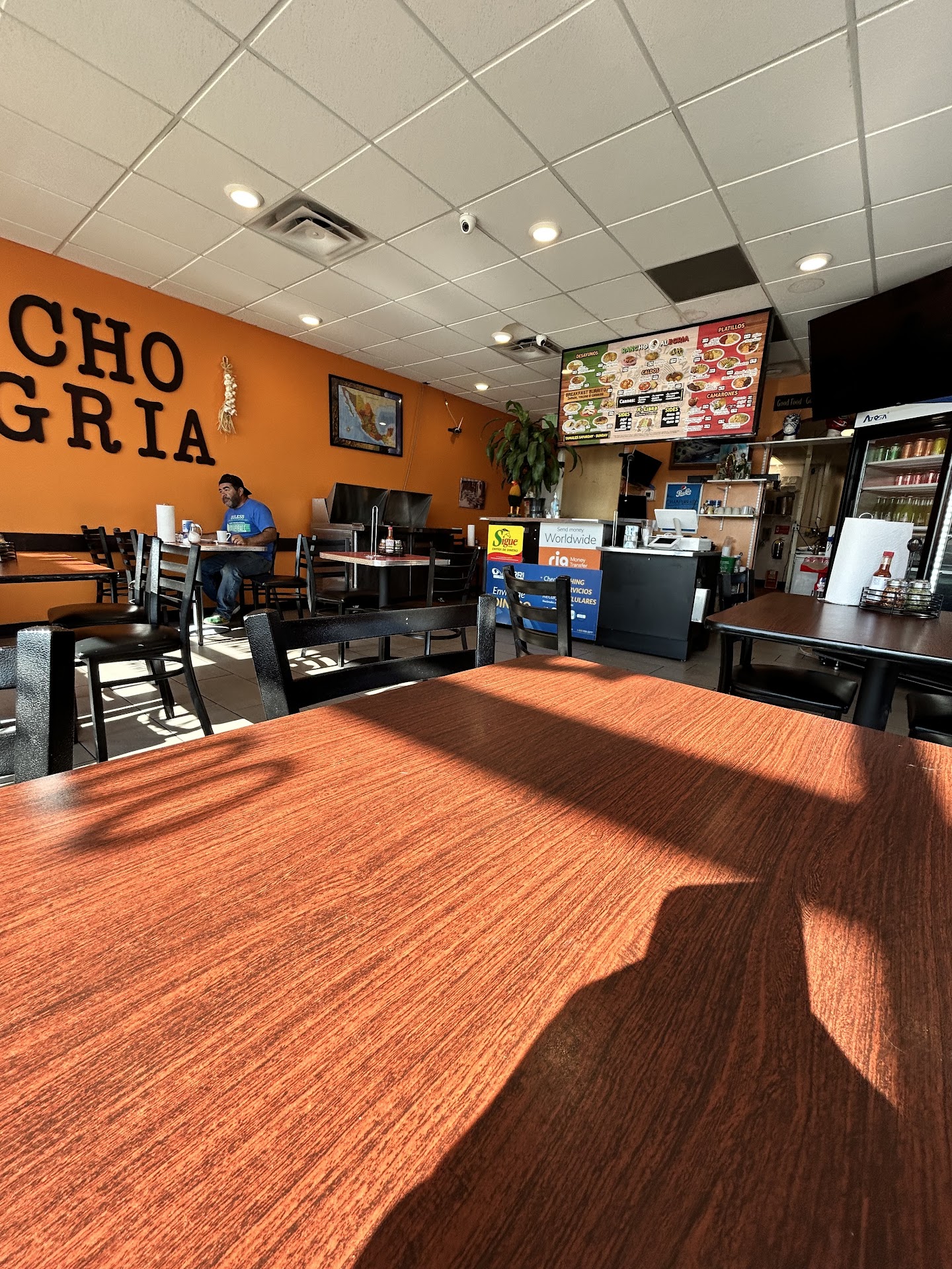 You enter Rancho Alegria #2 and are immediately welcomed by the colorful and joyful ambiance. The vibrant furnishings, artwork with a Mexican theme, and cheerful music create the ideal atmosphere for an enjoyable eating experience.