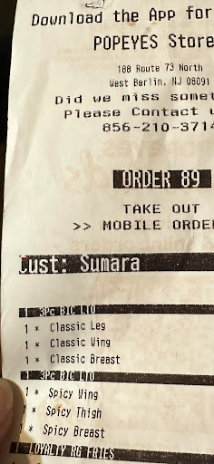 Read moreFor the 2nd time our order was incorrect. As they were prepping our order I explained how the previous order was incorrect. I was told this will not happen today. Got home. Oder was wrong again. Called and was told if they don't have the chicken pieces that are order they will replace it without informing the customer. Drove back to Popeyes so they can give us the correct orders, a young lady asked me what the problem was. Said she would handle it. Took the food from me and put it back in the chicken bin with the fresh chicken. Proceeded to put my correct order together and gave me fresh fries. After arriving home it hit me she took the food from me and put it back with the chicken they are going to serve other customers. How do they know if we touched that chicken?!? Guess what??? Order was still wrong. We threw the chicken in the trash and ordered some Indian food. WILL NEVER GO BACK TO THE WEST BERLIN POPEYES...