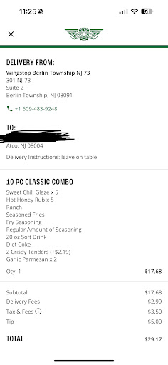 Read moreMe and my husband stop at wing stop on Saturday here is Berlin township. We waited over 20 min for our food and was still missing food. We ordered 8 wings Parmesan and 8 wings bbq, 4 chicken tenders, also ordered corn. Our fries was ice cold by the time we finally got our food. Service was rude they made it seem like it was our fault and not thereâs. By the time we got our wings and corn we saw that the chicken tenders are missing so we told the guy that works there and he seemed so annoyed that we ask for the food we paid for. The wait was the most ridiculous, 20 min for some wings? Never ever again will we eat there and we will make sure that our friends donât stop there either. Also the womanâs and menâs bathroom had no soap and no paper towels, we had to use toilet paper to at least dry our hands after rinsing them with just water after eating sticky wings, we also could not find a trash can outside in the eating area to trow away our trash, what a sad experience .There was food missing from almost every customer that came after us. This place is a waist of time and the service is very rude. I will never waist a single dollar over...