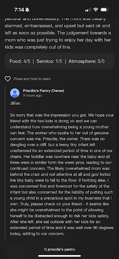 Edit: The owner deleted her response to the review I was referencing (JLares), which is what prompted me to leave my review. Likely because she recognized how accusatory, distasteful, and mom-shaming it came across. I’ve updated my review to include a screenshot...