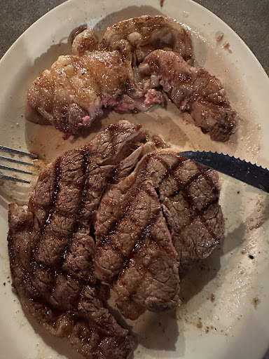 Upon inspection of the new steak, I was amused to find that it was at least 1/3 fat and gristle and separated as much of it as I could for a side by side comparison (as pictured). Completely giving up, I just asked for a box (I have enough faith in my cooking skills to salvage the “steak”) and my check.