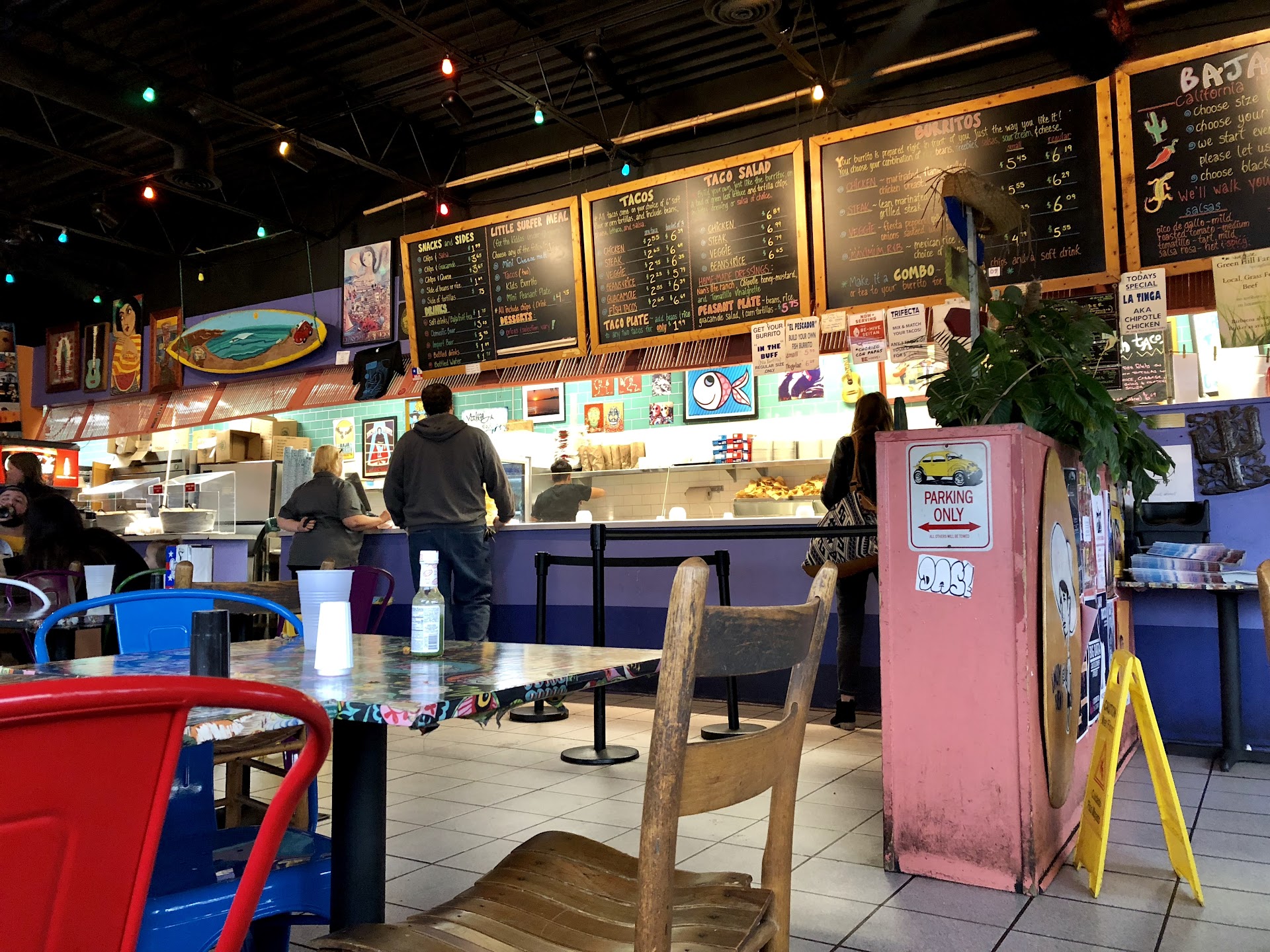 Onto the food: It's a better option than Chipotle or Moe's, in my opinion. Because it's not corporately owned, the atmosphere is of a well-loved hometown restaurant, because that's what it is. There's handwritten signs for the main menu and special items. Seating can be separate or communal, depending on how the tables inside are arranged that day. The patio seating is plentiful and features a cute cactus garden as well as table umbrellas.