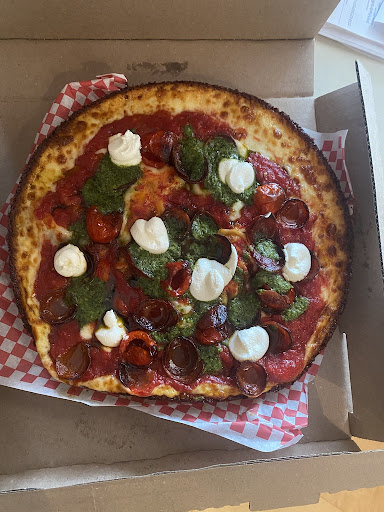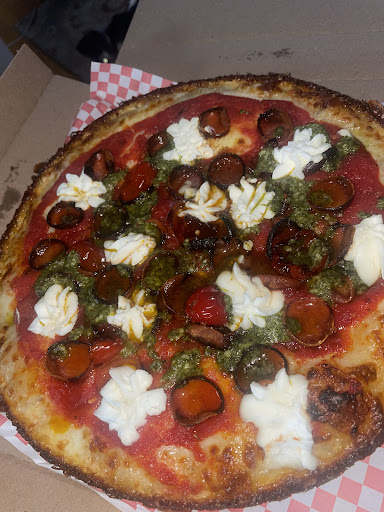 The pizza is very unique, nothing else like it in the area. Dough is crispy on the edges, very chewy and flavorful inside. Tomato sauce is yummy, very flavorful and not too sweet. Perfect amount of cheese, toppings were super high quality and creative.