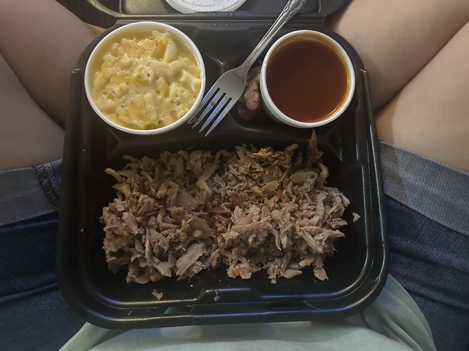 My husband and I placed a to go order through their website 9-29 around 8PM and the website was easy enough to manage and the order said it would be ready in 15-20 minutes. My husband was the one who picked it up so I canāt speak the atmosphere or service there. I ordered a pulled pork plate with a side salad and Mac and cheese. The side of Mac and cheese was really tiny but itās some of the best Iāve ever had. The side salad was a good portion and even came with packets of croutons which impressed me but they gave me fat free ranch instead of regular so it tasted funny :( The pulled pork was good meat, not a lot of fat or gristle in it (which is a huge issue for me at other BBQ places because I canāt eat it if itās got too much) so that was good but it was almost as if it hadnāt been smoked very long?? There just wasnāt a good smoky flavor to it which is weird because the whole block smells like them grilling all throughout the day every day. The BBQ sauce that came with the pulled pork was actually really good and I used it on my meat which I hardly ever do so thatās saying something. My husband got a combo plate with pulled pork and 1/2 chicken fried okra and corn on the cob. Let me just say thatās some of the best BBQ chicken Iāve had in my life and if we go back Iāll probably just get that. He said itās the same sauce as what I got with the pulled pork but it tasted WAY better so idk, maybe itās just because it was all over the chicken so it had a nice Smokey flavor because the chicken actually had that. He said the okra was good and he was impressed it was a full corn cob and not one of the tiny ones. He also ordered a pecan pie and he said it was just alright. I got us a gallon of tea and it was warm, they told him when he got there that they had just run out and just made fresh tea but it tasted sour and had an odd hint of BBQ/Smokey flavor to it, so I donāt know how much I believe it was fresh and if it was they need to clean whatever the make tea in WAY more frequently and/or thoroughly. We spent $50 which I feel like is a little steep for what we got compared to other places but Iām not totally mad at it either because it was at least a decent portion of meat although the side of Mac and cheese left more to be desired for sure. Weāll probably be back and give the pulled pork...