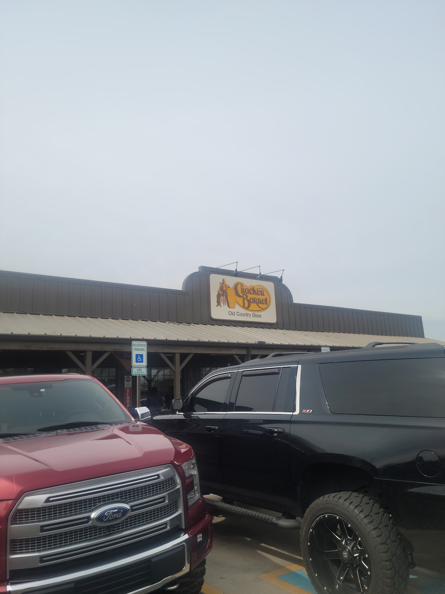 Read moreI usually don't have bad experiences at Cracker Barrel and I usually don't leave reviews criticizing a restaurant because I've worked restaurant half my life. I will preface all this by saying it was 8:45 when we walked out of there and they close at 9. However... When we arrived we were going to be seated right behind the hostess table... in the entry way where there's no room around the chairs it looked tight and uncomfortable and both my husband and I struggle a little with claustrophobia so we asked for a different table they let us move. That was very kind. When we did move no one came for our drink order for quite some time. When she did come she was very nice, took our order came back with our drinks and we made our orders really simple-exactly the same. Lol I ran out of my drink before she brought our food and sat silently after she brought our food waiting for her to come back with the drink and my husband kindly let me drink his since we ordered exactly the same lol I drank both our drinks completely dry and still waited so I loudly sipped after we looked everywhere for our waitress. She then came but at that point we were ready to get boxes and our ticket. My husband asked for boxes and our ticket but she didn't bring both she brought boxes and disappeared again then we tried pursuing her for the ticket again. Now to the food: 😒 I have NEVER been to a cracker barrel that served burnt and I mean literally black on the top biscuits. Never would I dare to let that exit my kitchen as acceptable to eat. I didn't bring my phone in with me and didn't take pictures while we were eating but I was hungry enough that day to melt butter on and eat the burnt hockey pucks. Now.. the chicken and dumplins. Dry. No broth or sauce to speak of... nothing to dip my burnt biscuit in... took it home to Dr it up and save it. The hashbrown casserole...😱 crispy like burnt rice.. had I had dentures I wouldn't have eaten it for fear of breaking something.. I saved the fried chicken because I have an amazing air fryer for reheating. I ate the meatloaf but then felt sick later that evening and the only thing I ate after 7am was their food. And I've been fine today. I may end up not reheating or trying to save any of our leftovers. I will say that the manager handled the situation well. We weren't even going to say anything about it and pay and leave but they asked us how we liked our meal and I was honest about our food experience. She greatly apologized and tried to make it up with a gift card but now we don't know if we can trust to go back and feel people should know...