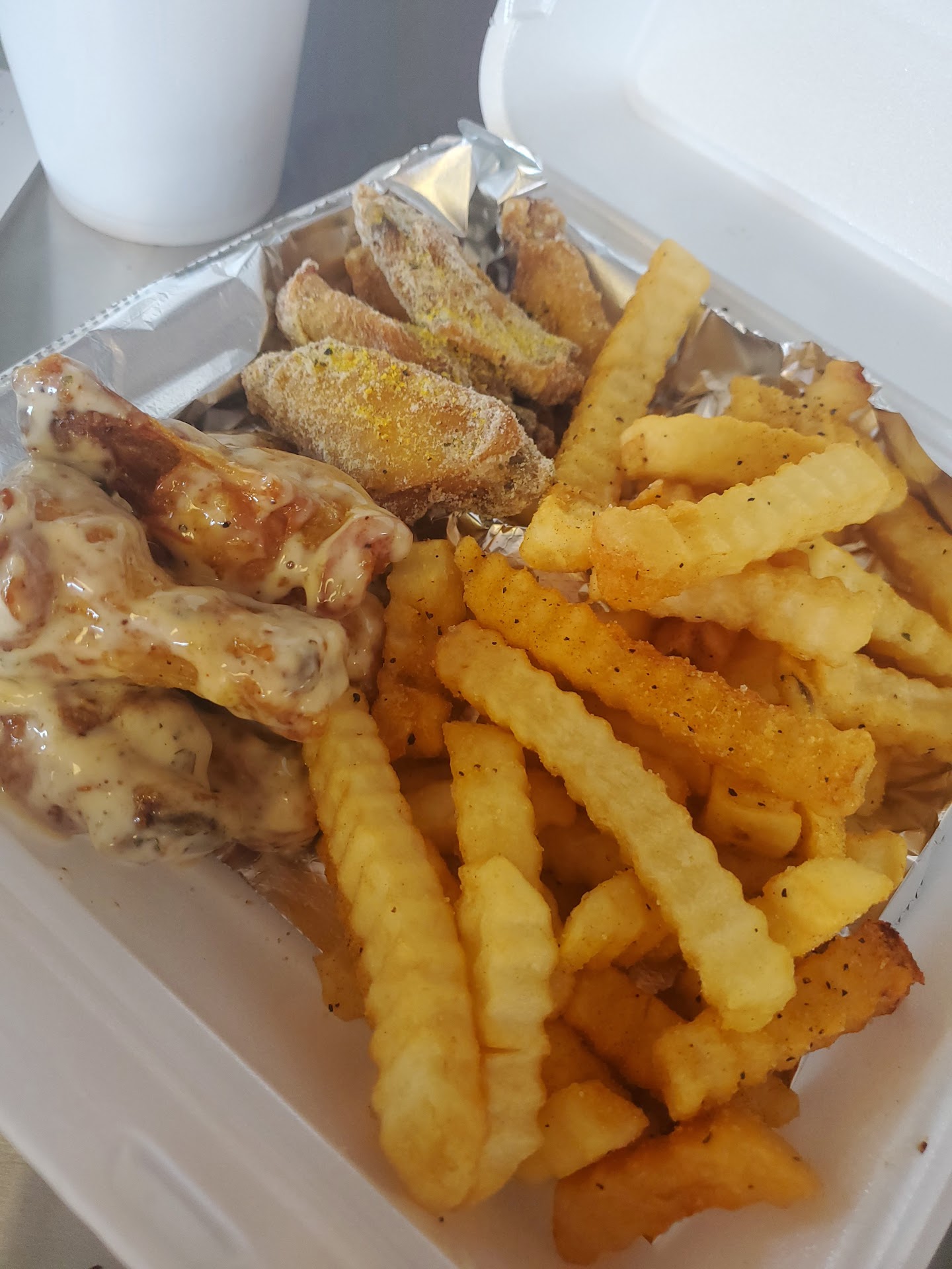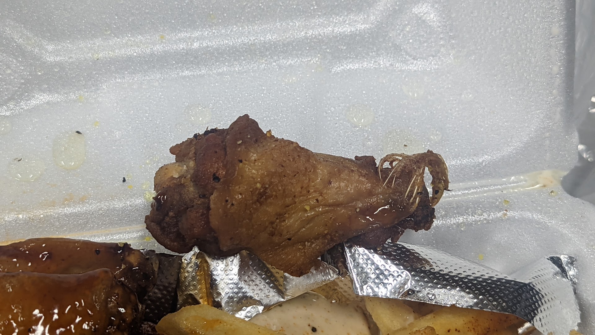 As you can see from the picture, 1 of the wings still had it's wings, literally. That should have been enough toss the meal but I really wanted to try the food. Lemon pepper had decent flavor but there wasn't enough lemon pepper. I then tried a bite of the honey hot and while the flavor was good the wing had a real off taste to it. I knew that if I continued my stomach was gonna regret it. Those few bites of wings I tried had me feeling a little off.